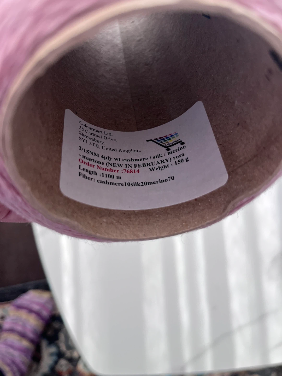 205Selling a cone of Colourmart yarn in a lovely rosa colour! This is a 4ply yarn made of a blend of cashmere, silk, and merino wool. The cone weighs 150g and has a length of 1100m. The fibre content is cashmere10silk20merino70