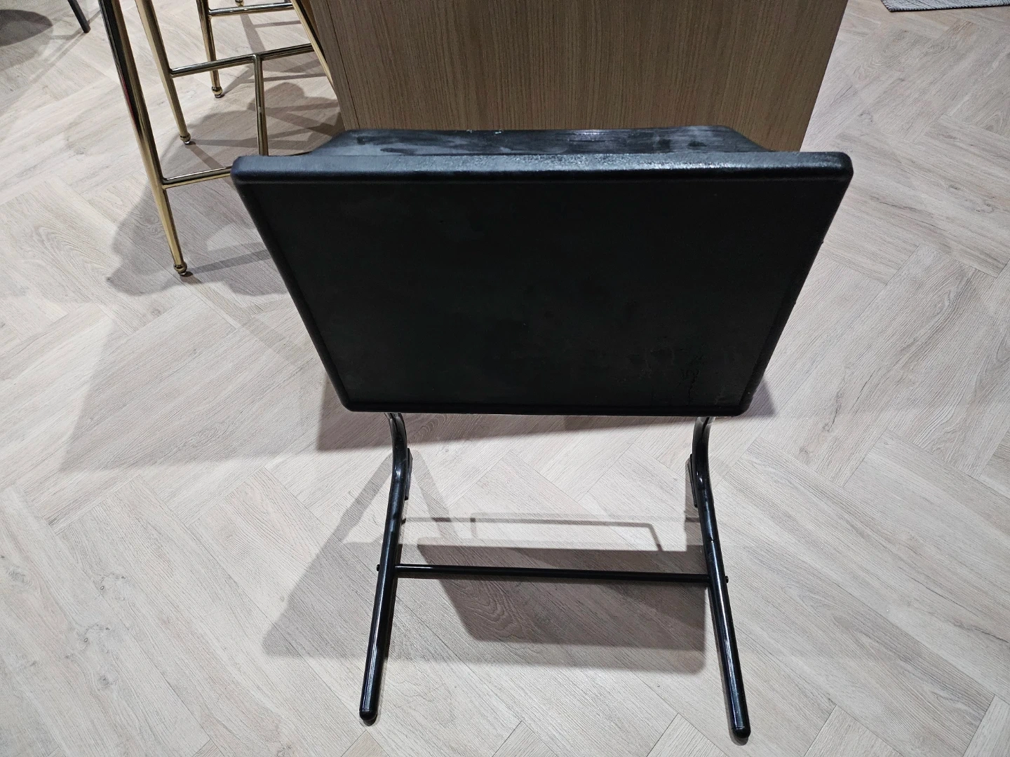 Selling a handy folding table, perfect for small spaces! It's black and comes with a convenient cup holder. Great for snacks, working on your laptop, or just relaxing