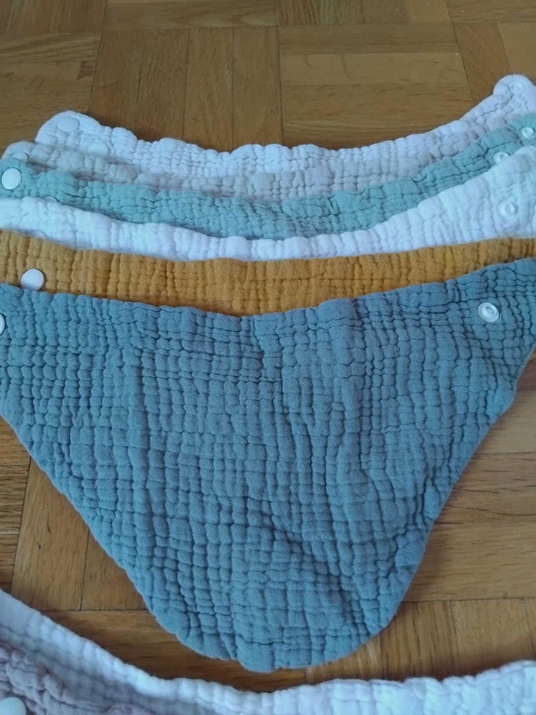 Selling a set of ten baby bibs in various colours! They're made of a soft, textured material and have snap closures. Perfect for keeping your little one clean during meal times