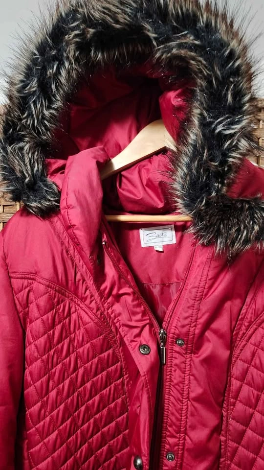 This is a stylish and warm red puffer jacket, perfect for chilly days! This jacket has a quilted design, a faux fur-trimmed hood, and a comfortable fit. This item is used, but it is in good condition and ready to wear.