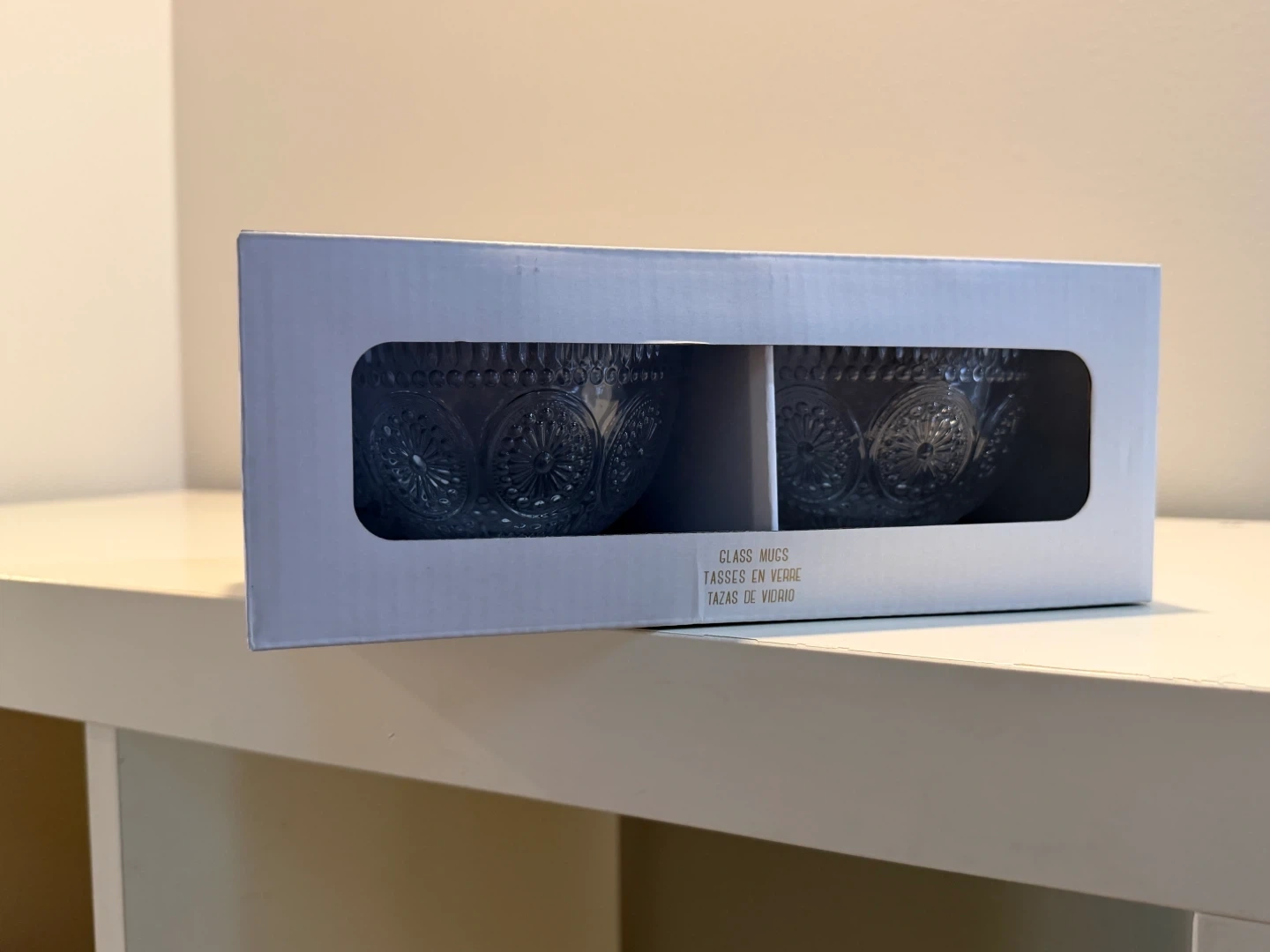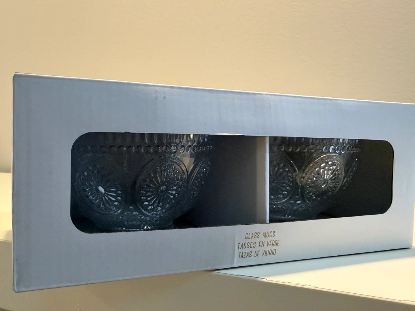 Selling a brand new set of HOMESEN glass mugs. The set includes two beautifully designed glass mugs, perfect for adding a touch of elegance to your kitchen or dining area. They come in the original box!