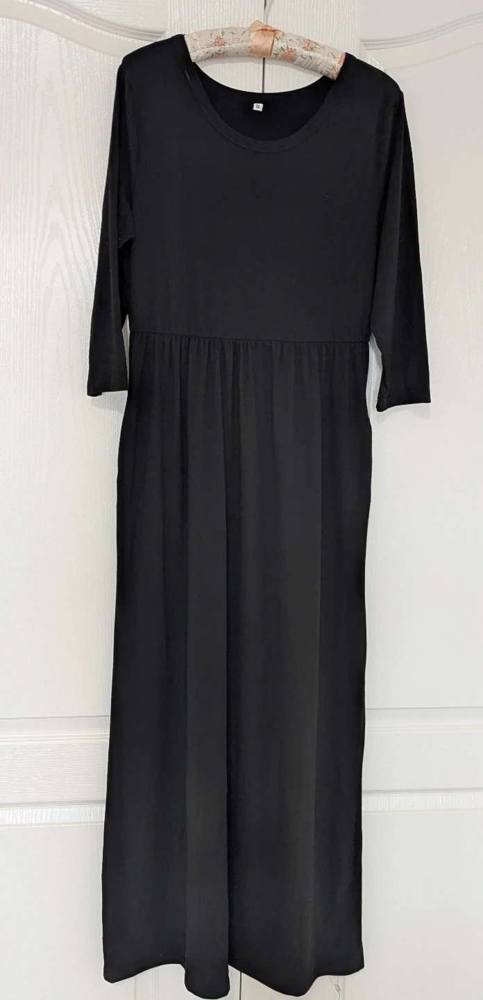 Classic black dress with 3/4 sleeves. It's a comfortable and versatile piece for any wardrobe. Size M. Never worn.