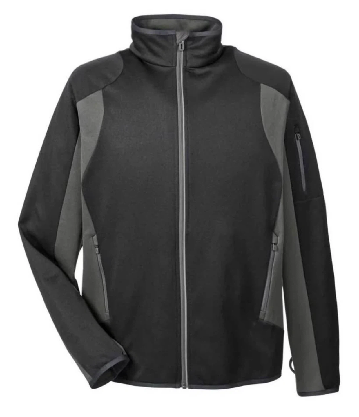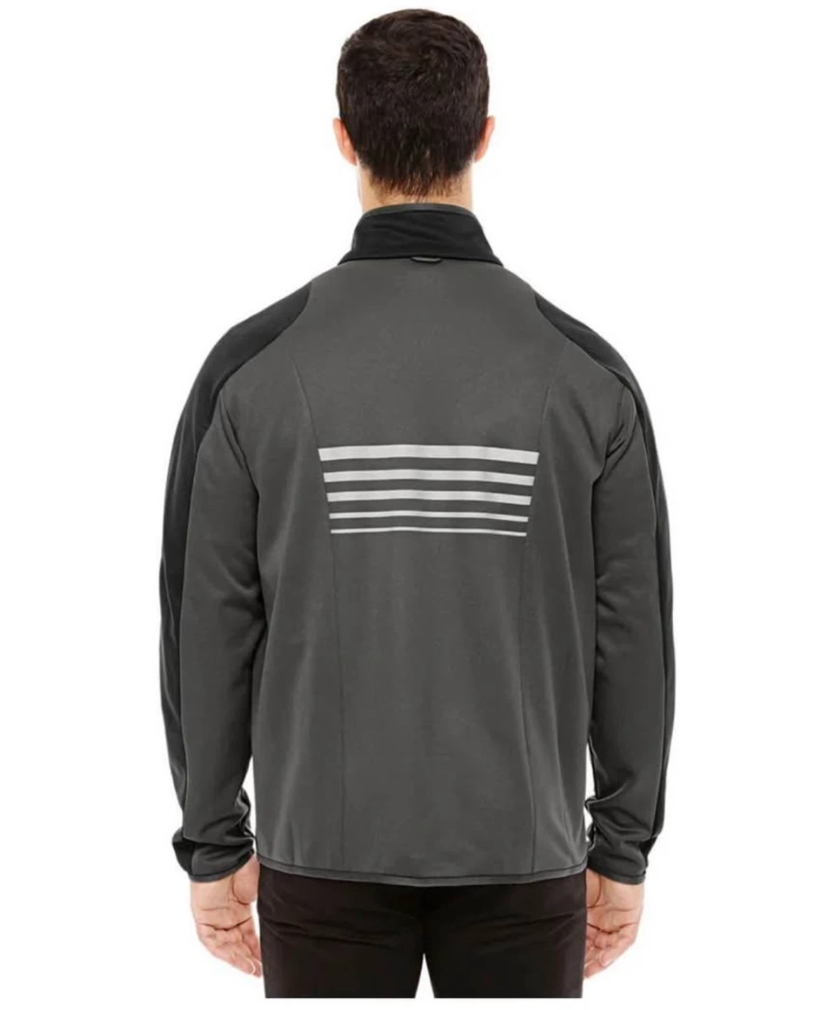 Here's a North End full zip jacket in black and grey. It features reflective details, moisture wicking fabric, and an audio port. Perfect for staying comfortable and visible during outdoor activities!