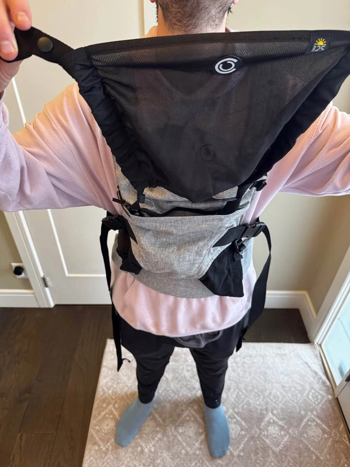 Carrier can be used many ways - as seen in photos. Also includes sunshade and pockets. Can be put on with only one person.