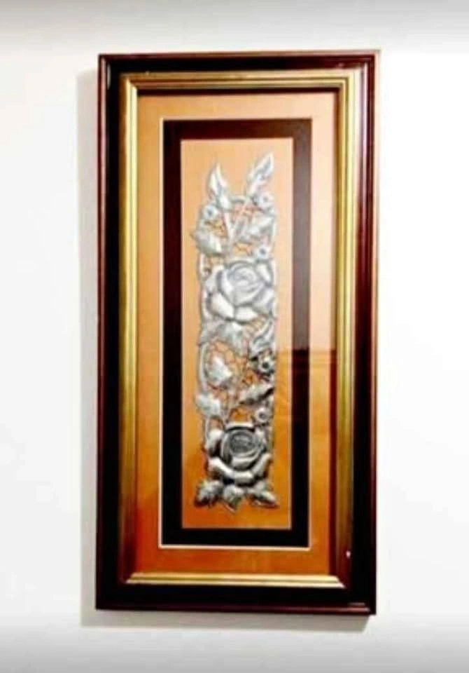 65Vintage, very rare, hand crafted floral metal art ((Rapujado Art)) large glass wall frame. Signed artist: Marcia. Dated: 2004. Glass wooden frame. Dims: 29 * 56 cm. Please check out my other rare collectibles!