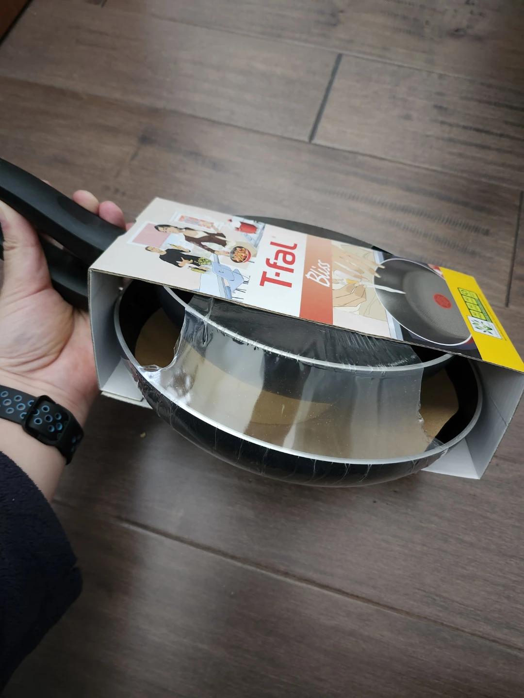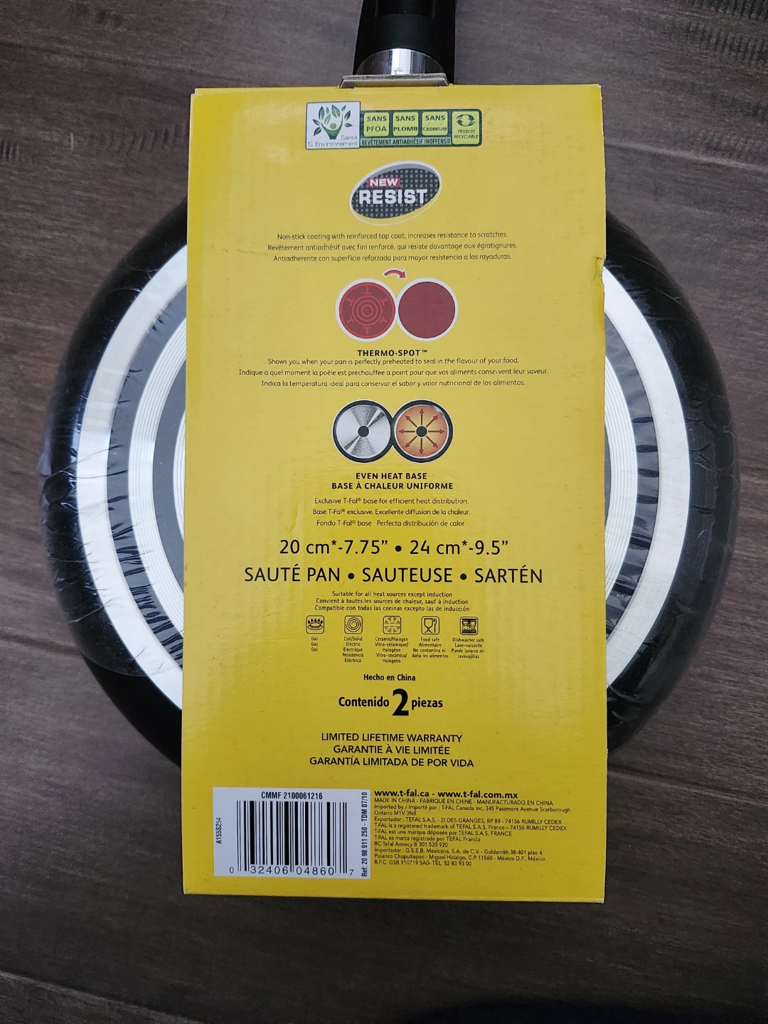 I have a brand new T-fal Bliss pan set of 2. It's 20cm & 24cm and has a Thermo Spot indicator to show when the pan is preheated. The pan has an even heat base for efficient heat distribution and is suitable for all cooktops excluding induction. Comes with the original box and packaging
