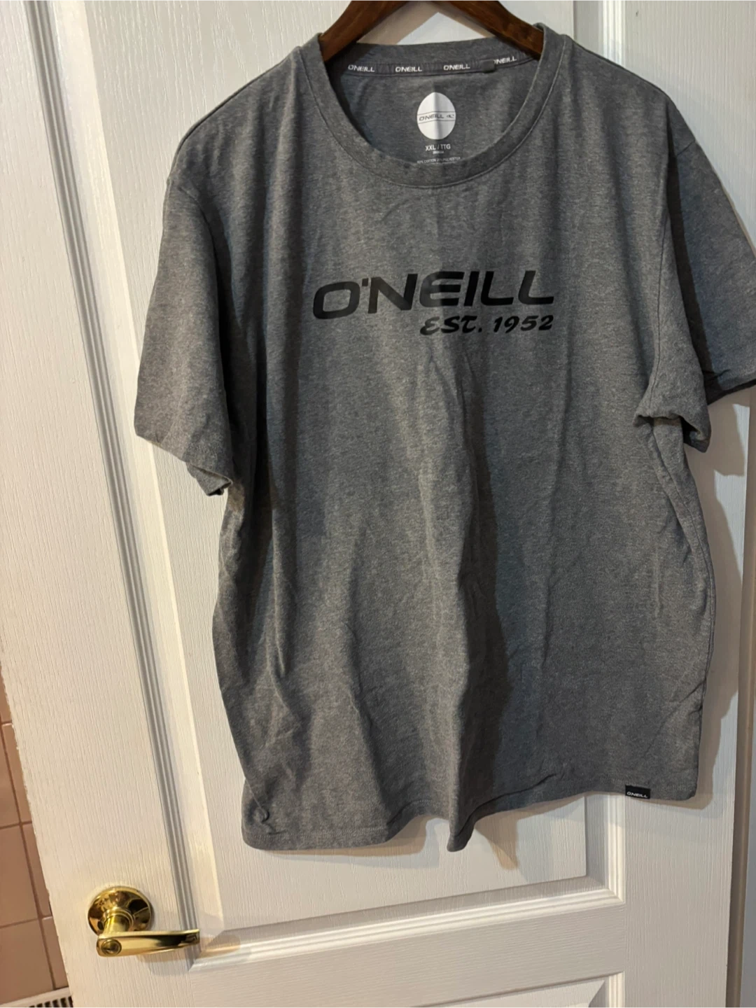 O'Neill grey t-shirt in size XXL. It's made of 80% cotton and 20% polyester CASH ONLY