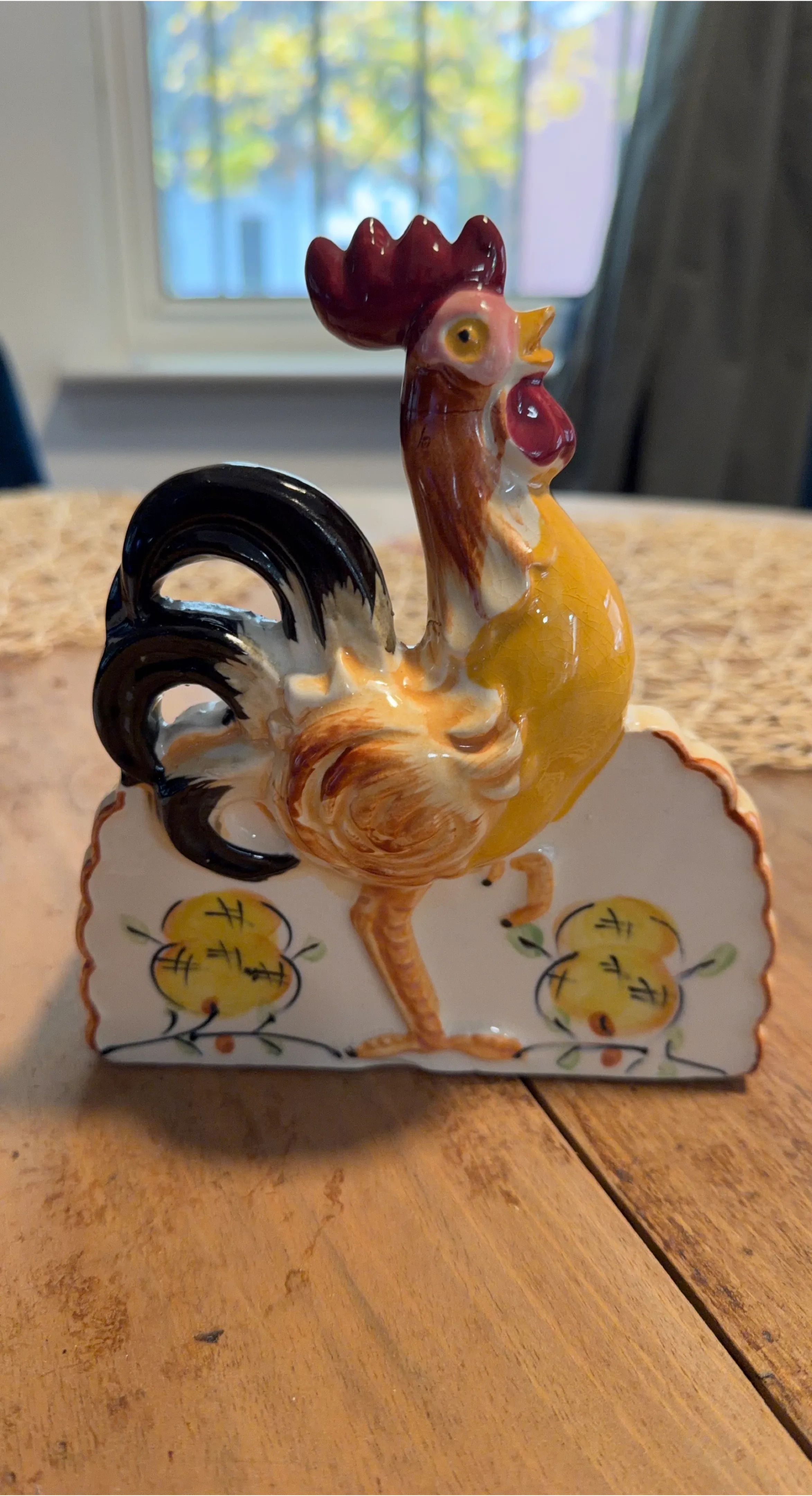 Selling a vintage ceramic rooster napkin holder. It's a charming piece with a colorful design, perfect for adding a touch of rustic flair to your table setting