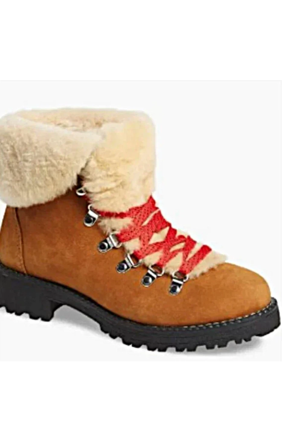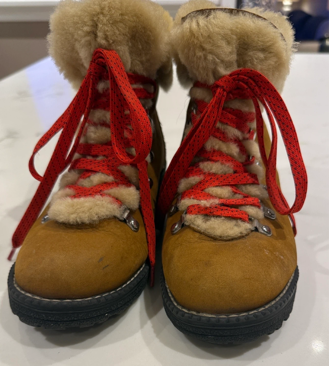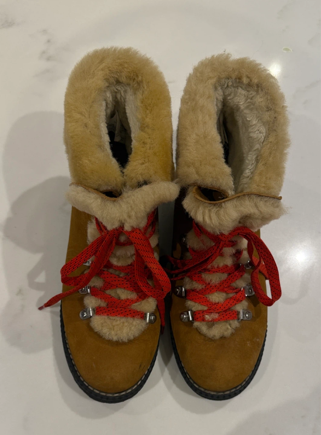 These are a pair of J Crew Women's Explorer Sheepskin Boots. They have a tan/brown colour with red laces and fur trim. They look like they are in good condition and ready for a new home!