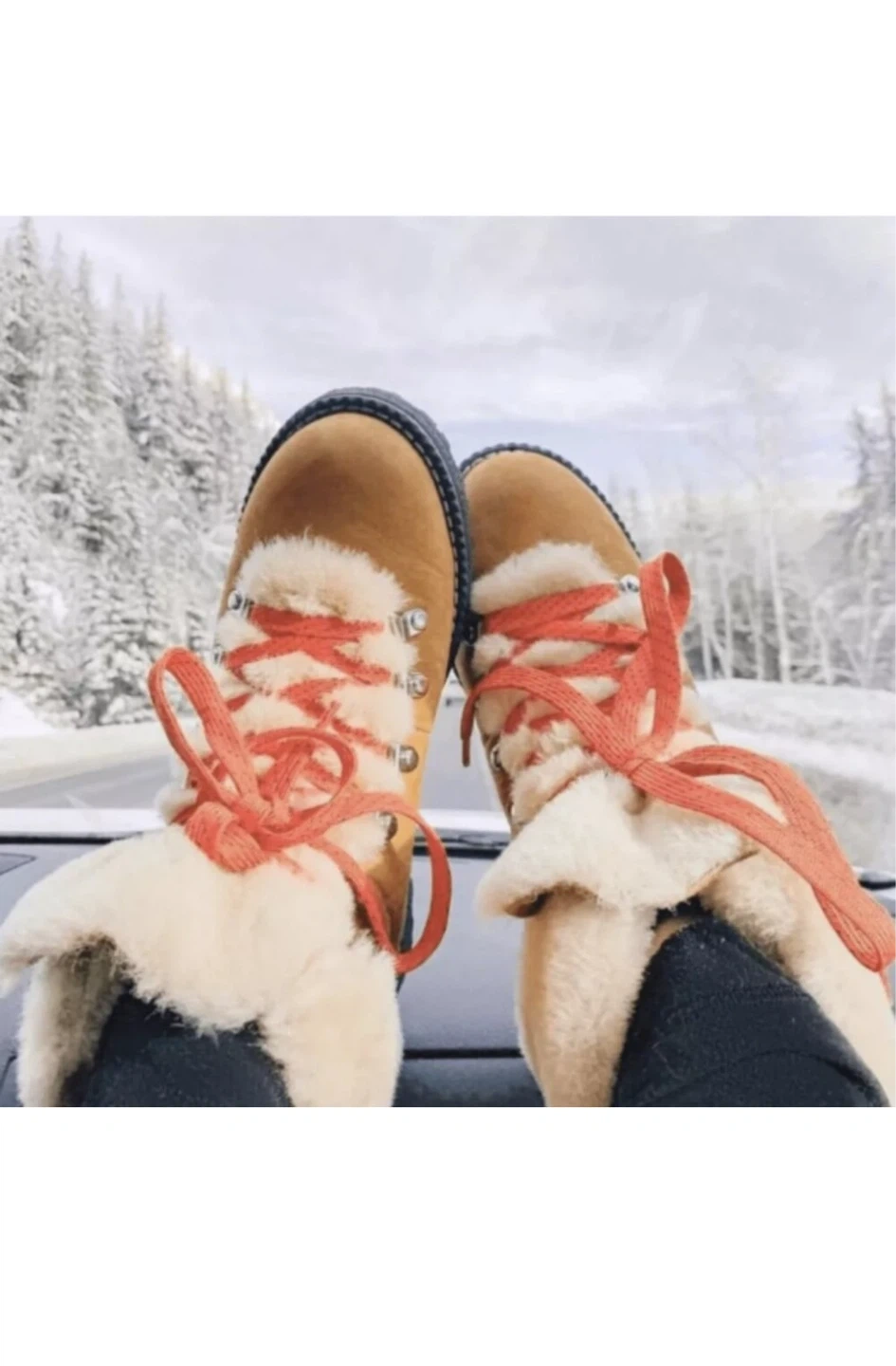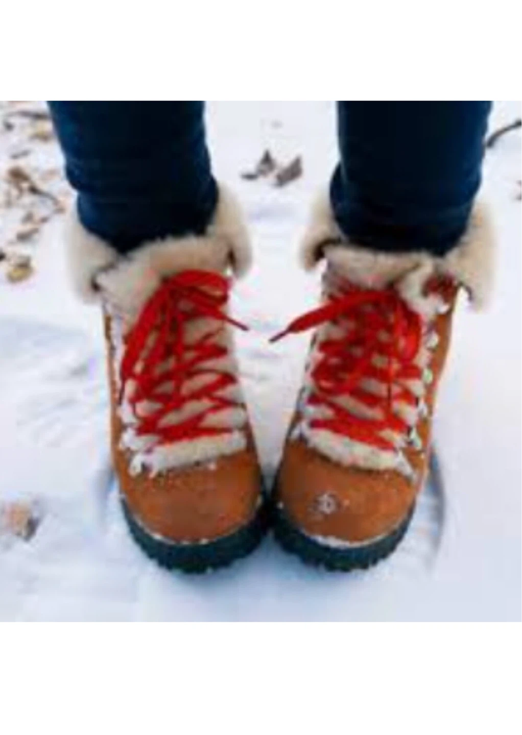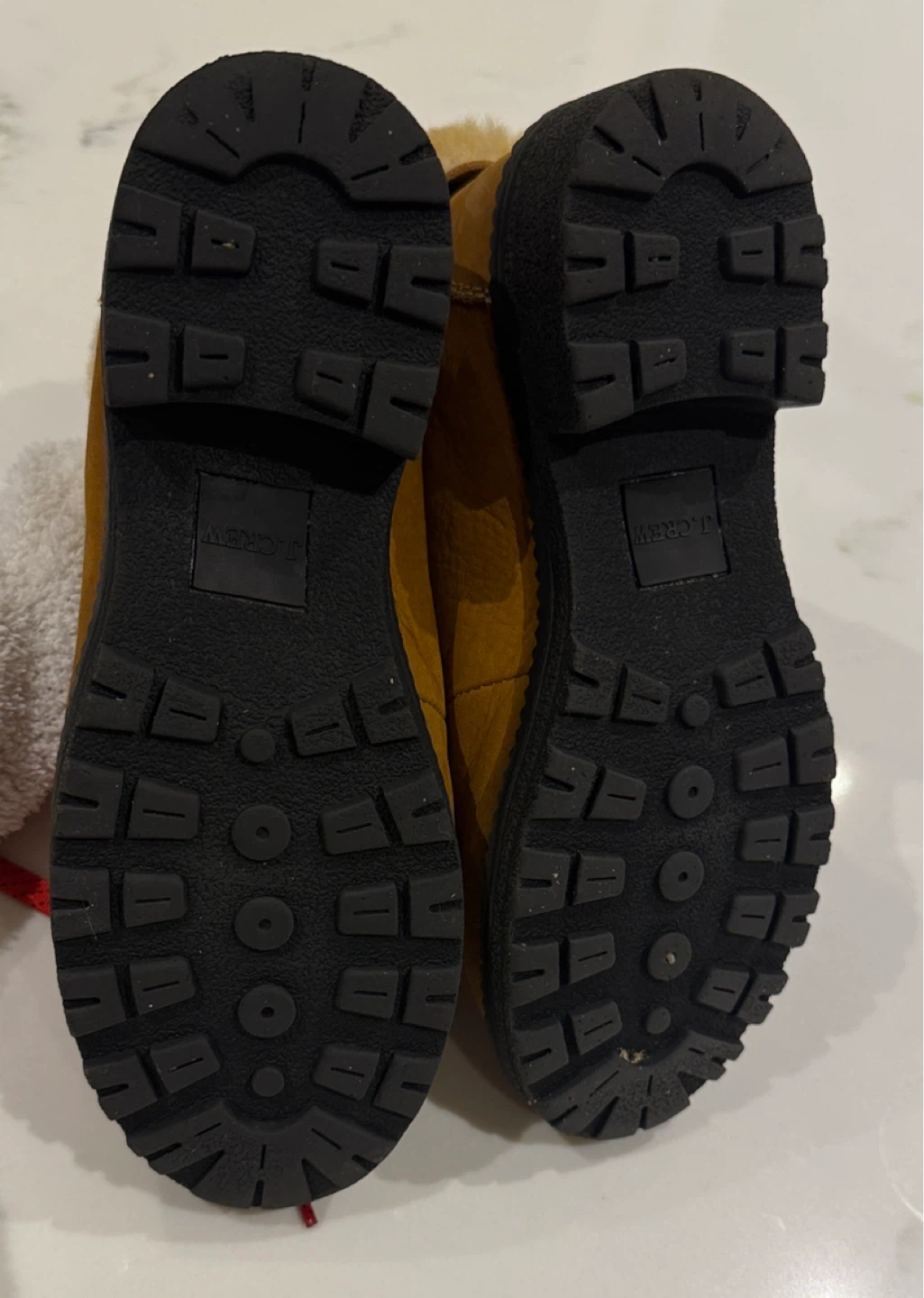 These are a pair of J Crew Women's Explorer Sheepskin Boots. They have a tan/brown colour with red laces and fur trim. They look like they are in good condition and ready for a new home!