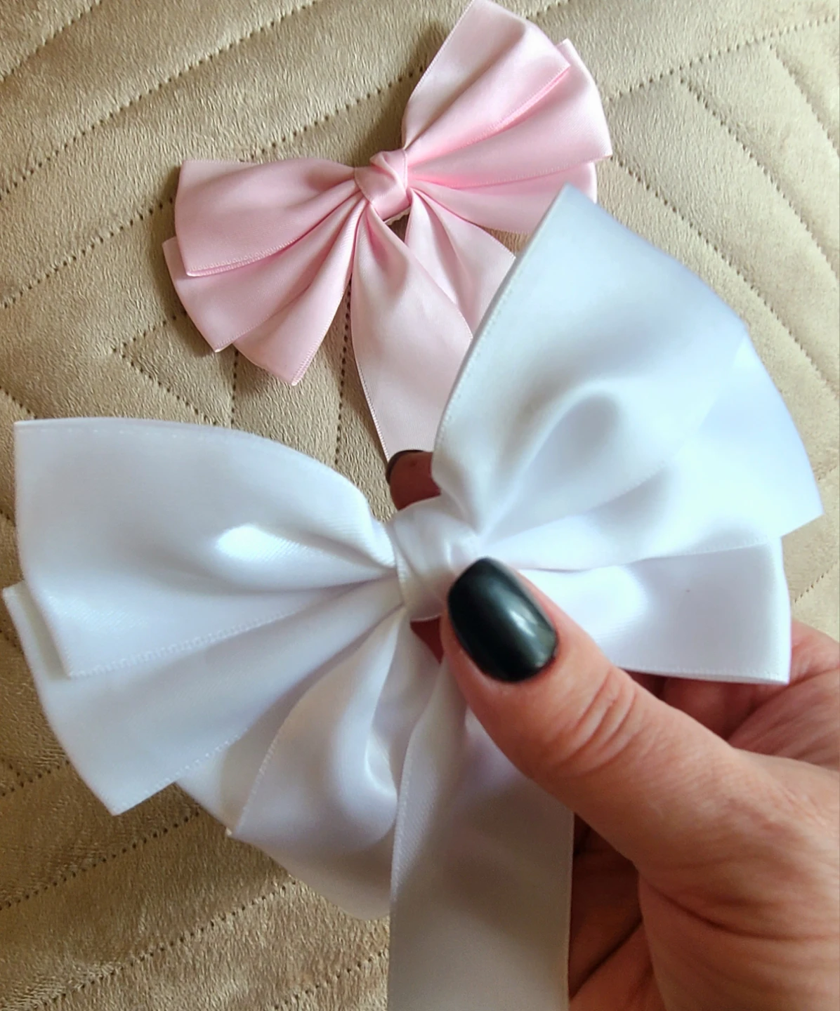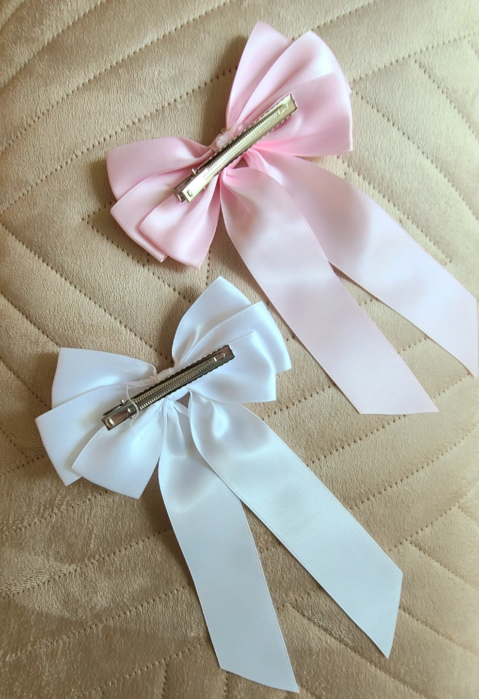 Two adorable hair bow clips! One is a soft baby pink and the other is a crisp white. Perfect for adding a touch of sweetness to any hairstyle