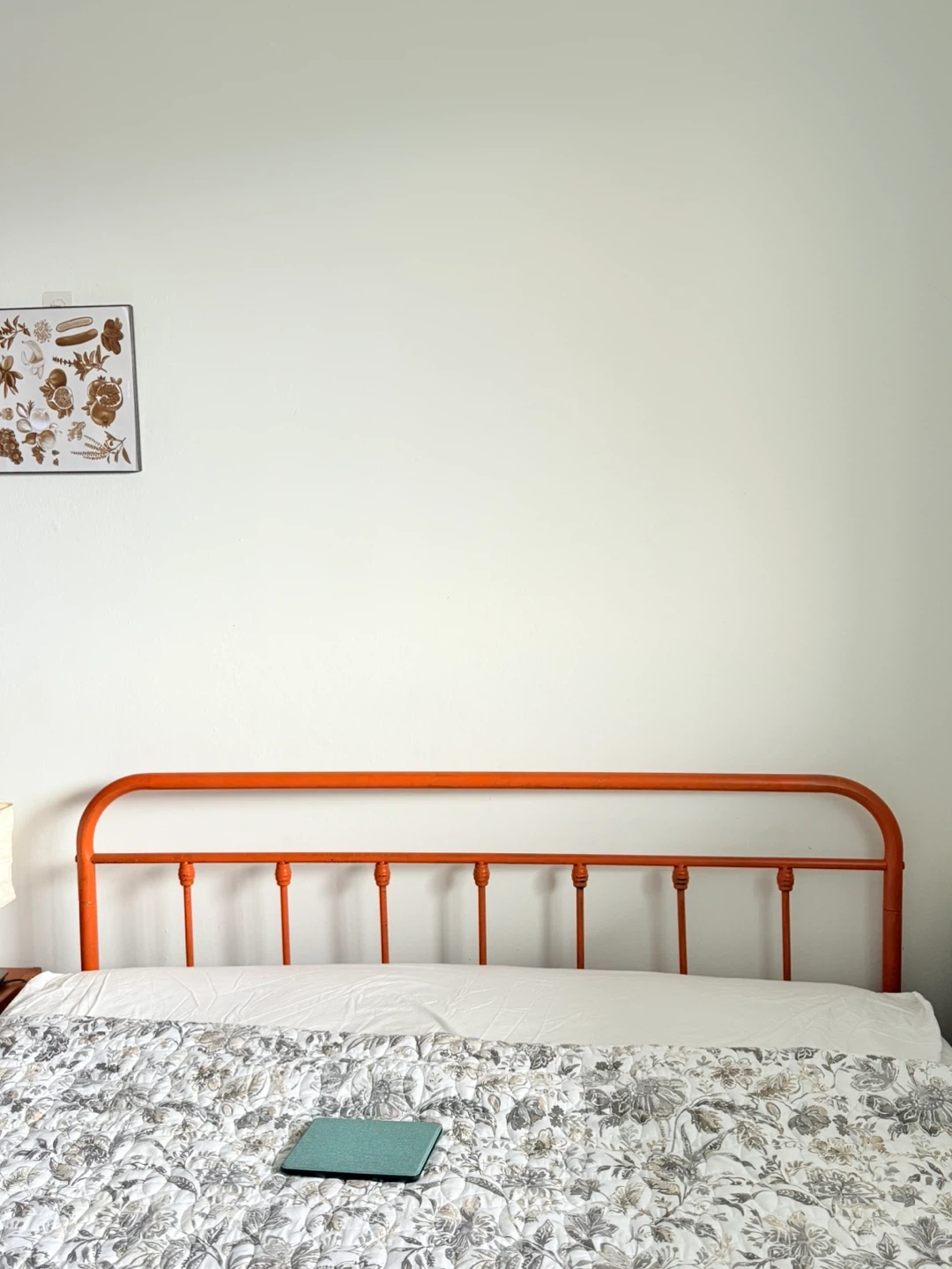 Selling a sturdy metal bed frame in a fun rustic orange colour! It's in great shape and ready to add a pop of colour to your bedroom.
