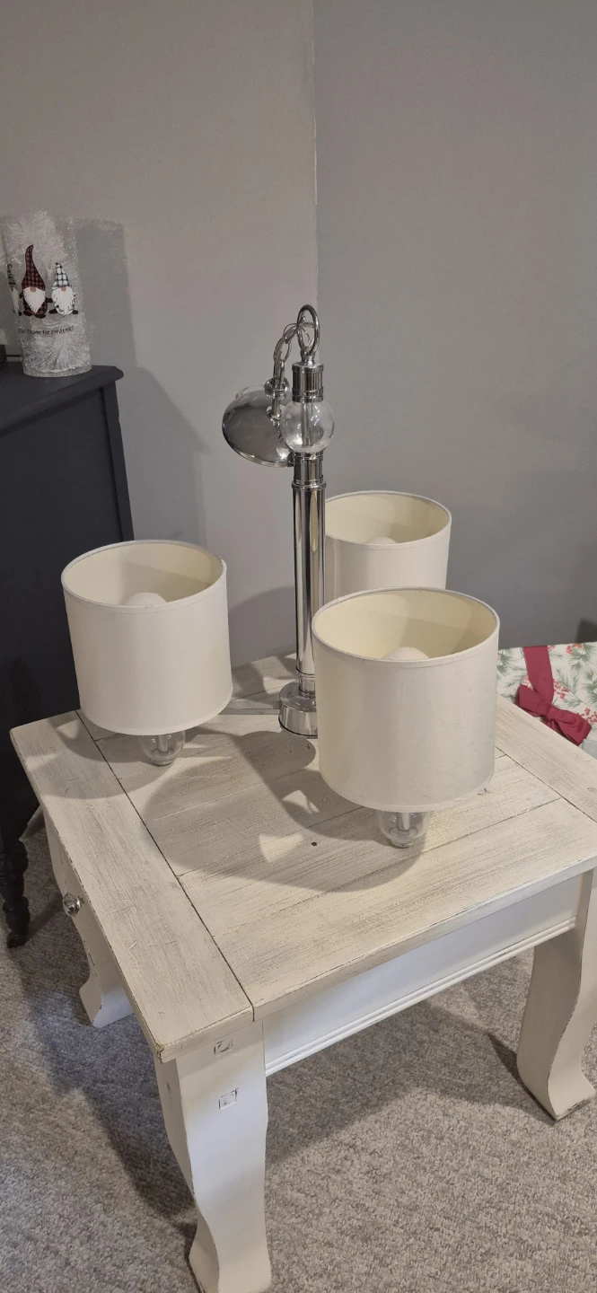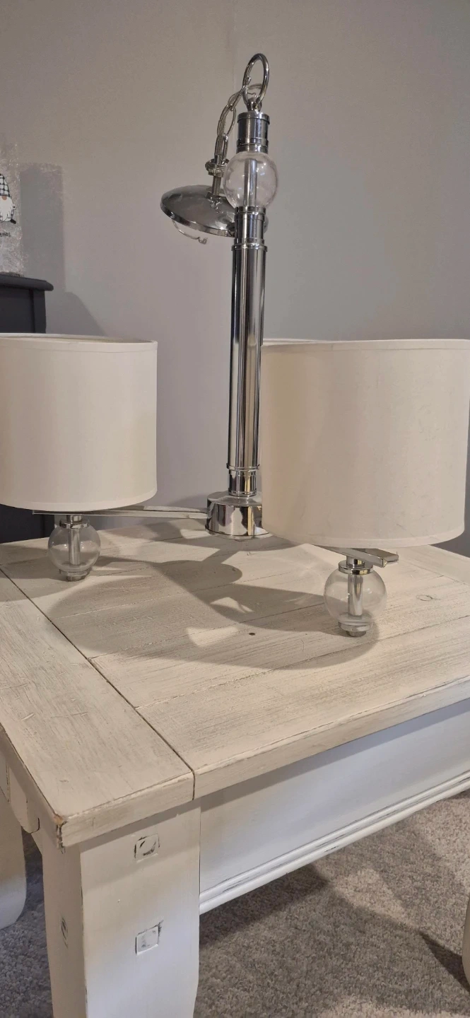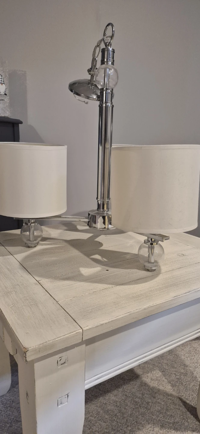 Here's a stylish 3-light hanging fixture with a chrome finish! It features three lights with cream white shades and clear decorative glass balls at the base of each light. Perfect for adding a touch of modern elegance to your kitchen, living, or dining area.