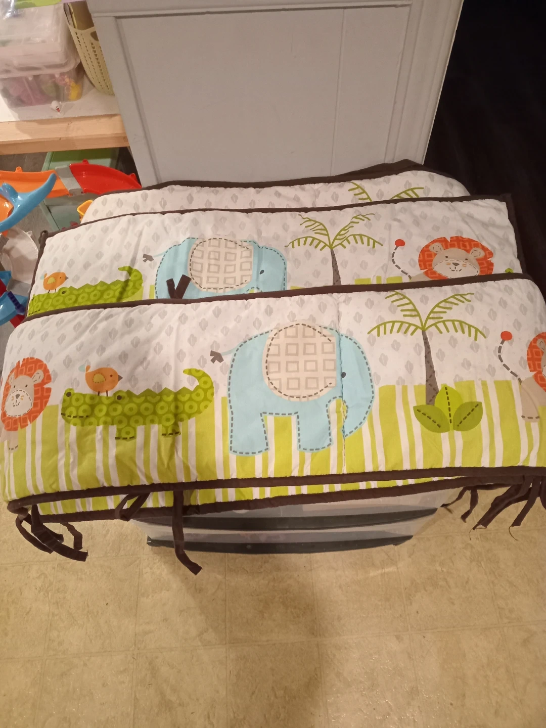 Selling a set of baby crib bumper pads! They're in great shape and come in a variety of cute designs, including elephants, lions, and crocodiles. Perfect for adding a touch of fun to your little one's nursery and providing extra protection