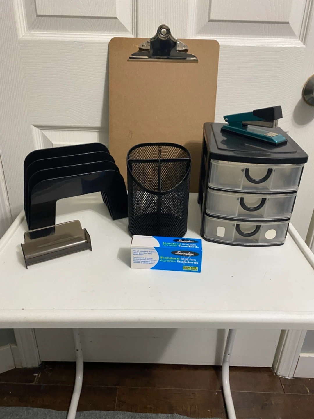 Selling a bundle of office supplies including a clipboard, desk organizer, stapler, staples, file organizer and a small drawer unit. Everything you need to get organized!