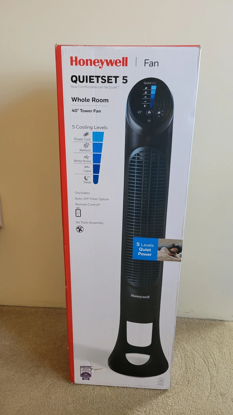 Enjoy the comfort of a quiet, cooling breeze with the Honeywell Quiet Set tower fan. With Quiet Set technology and 5-speed controls you can get the optimal cooling with adjustable quiet levels. It offers 75 degrees of oscillation for a wide cooling area, plus its space-saving design makes it the ideal fan to keep any room cool, regardless of size.