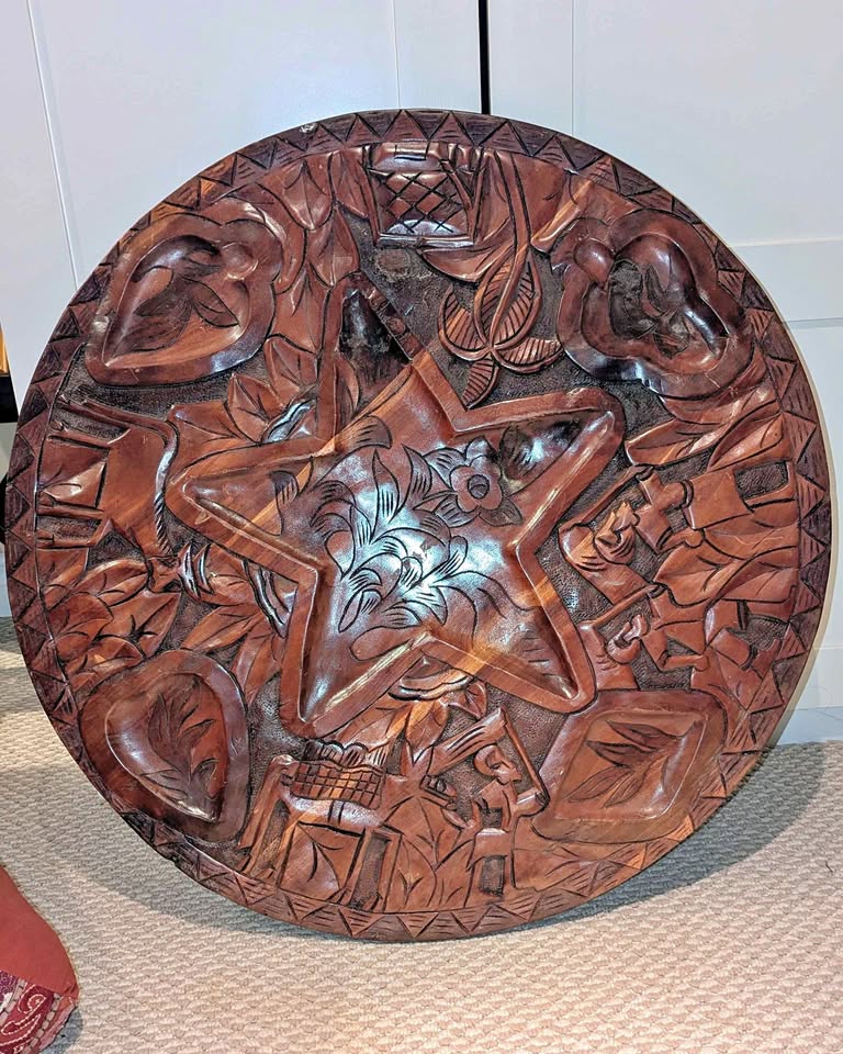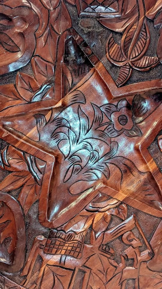 Beautiful vintage double-sided carved hardwood tabletop featuring an 8×8 chess/checker grid on one side and an ornate carved star-center motif on the other. Floral, leaf, and bird designs are carved throughout, giving it a warm, global artisan look.