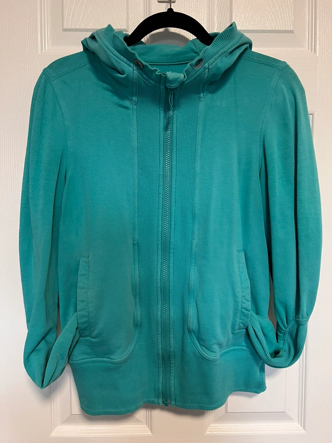 Turquoise, full zip with rouched shoulders, mid back and hood for a flattering fit