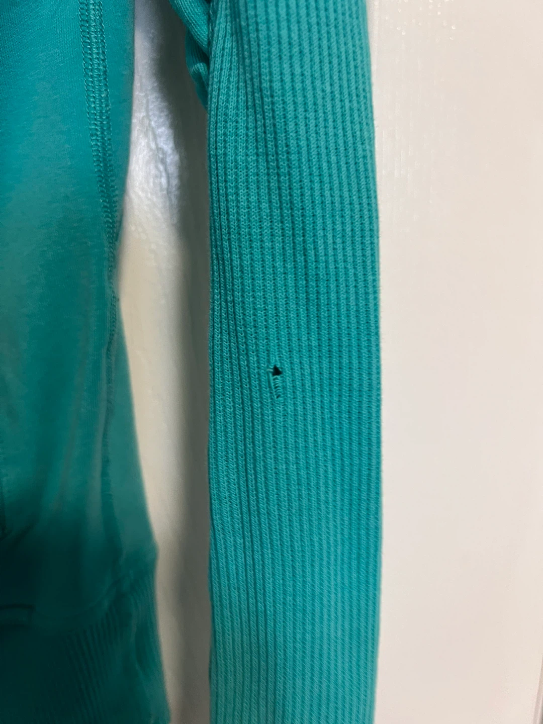 Tiny kitten claw hole on left arm as seen in photo