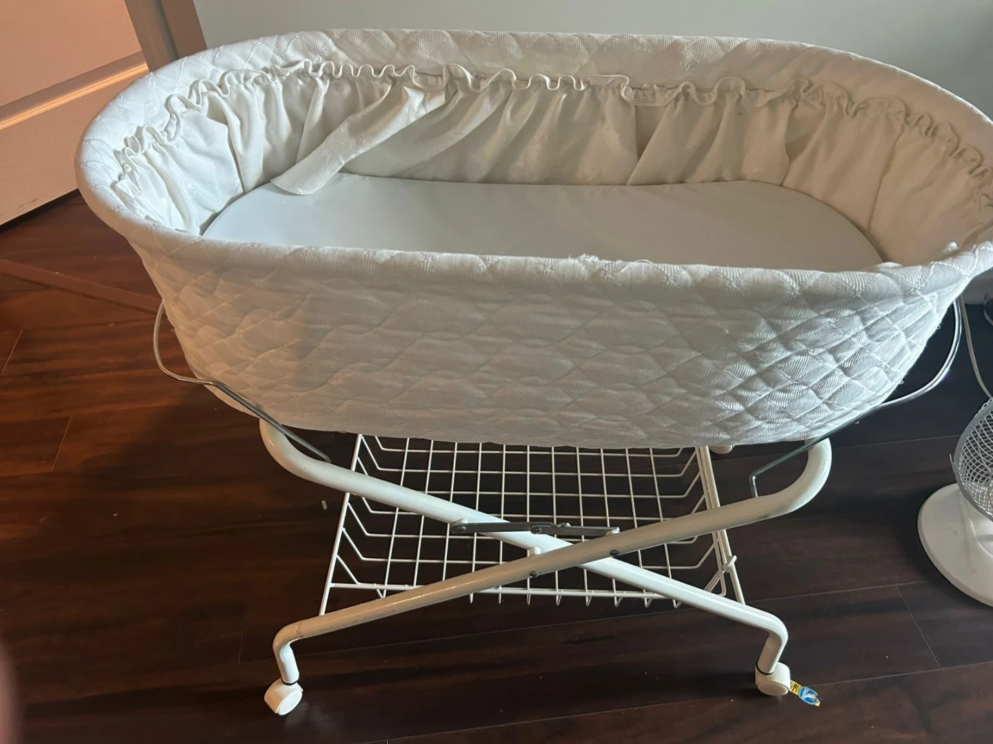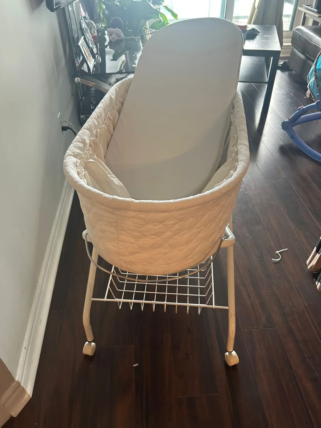 Selling a gently used white bassinet with a stand. It's in great condition and perfect for a newborn. The bassinet is a cozy and safe place for your little one to sleep. Comes with a mattress pad and a storage basket underneath for diapers and other essentials.Includes 10 mattress cover