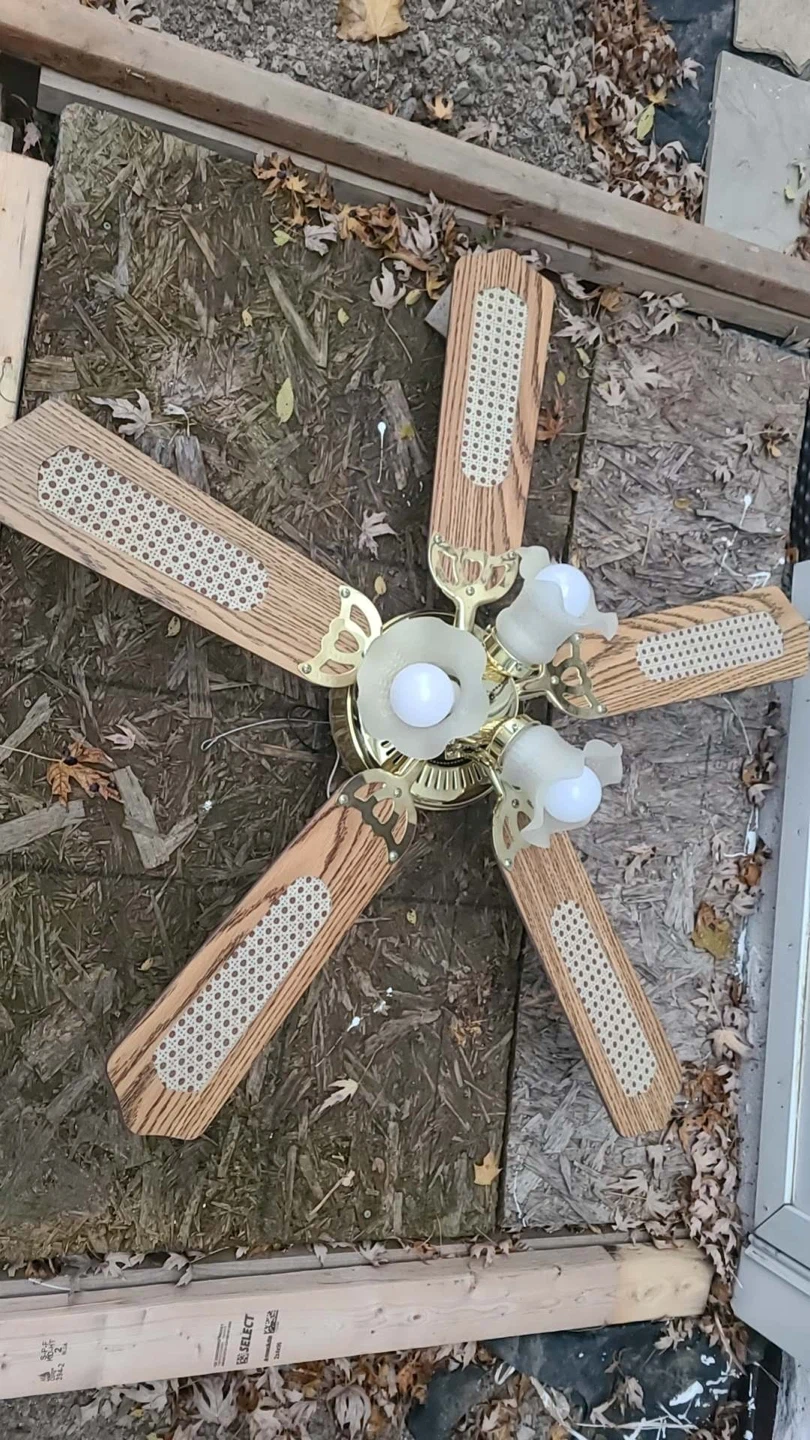 Selling a used ceiling fan with a light kit. It has five blades and a gold-tone fixture with three frosted glass shades. Great for adding a touch of classic style to any room