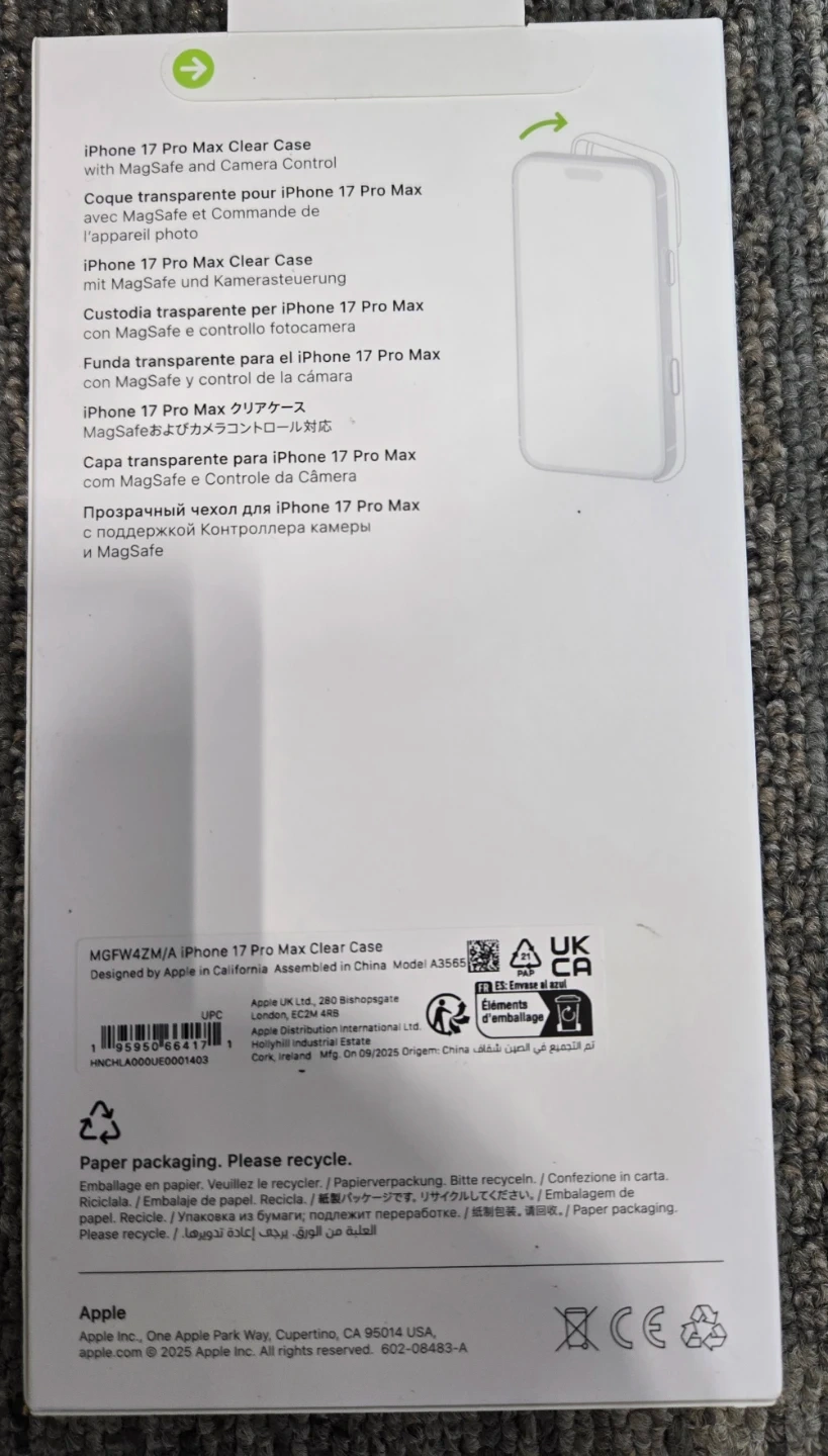 Selling a brand new authentic Apple iPhone 17 Pro Max Clear Case. It comes with MagSafe and camera control. The case is designed by Apple in California and assembled in China. Model A3565.
