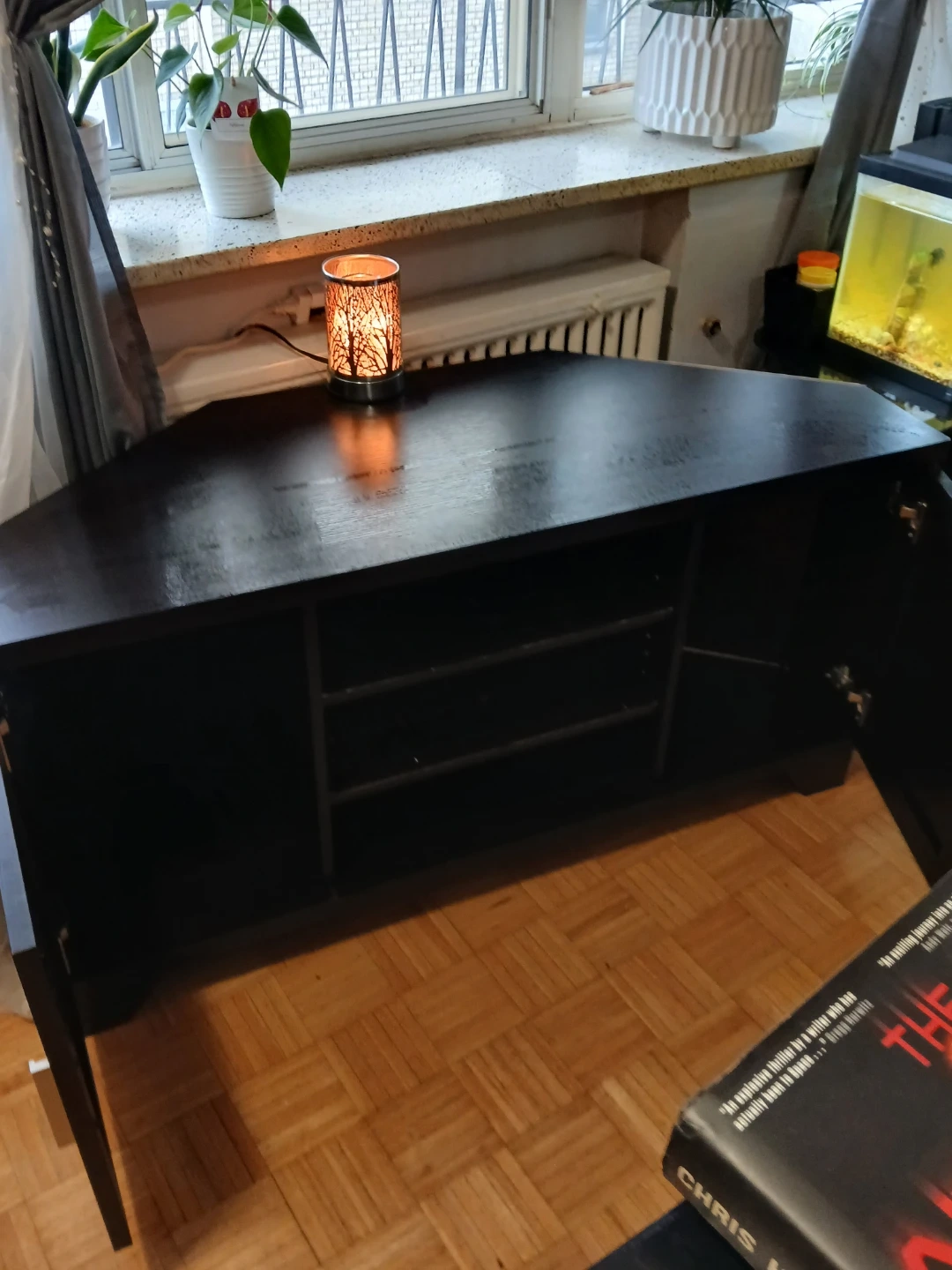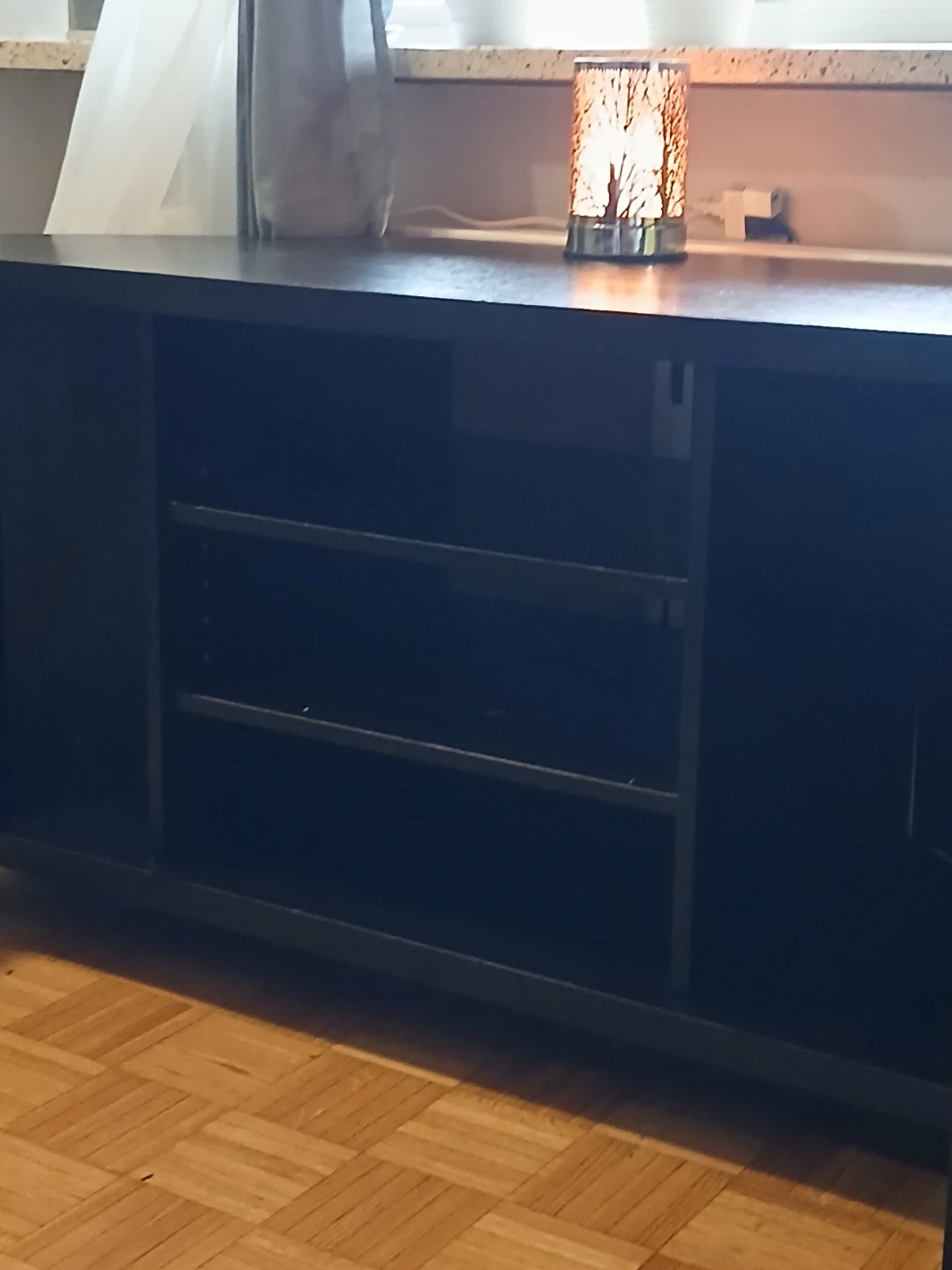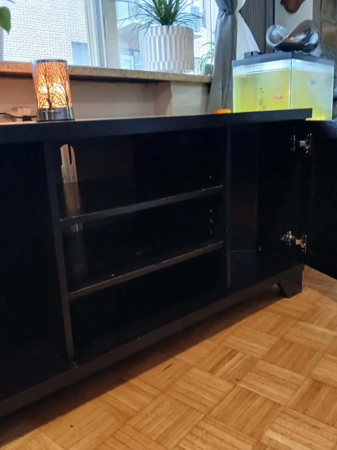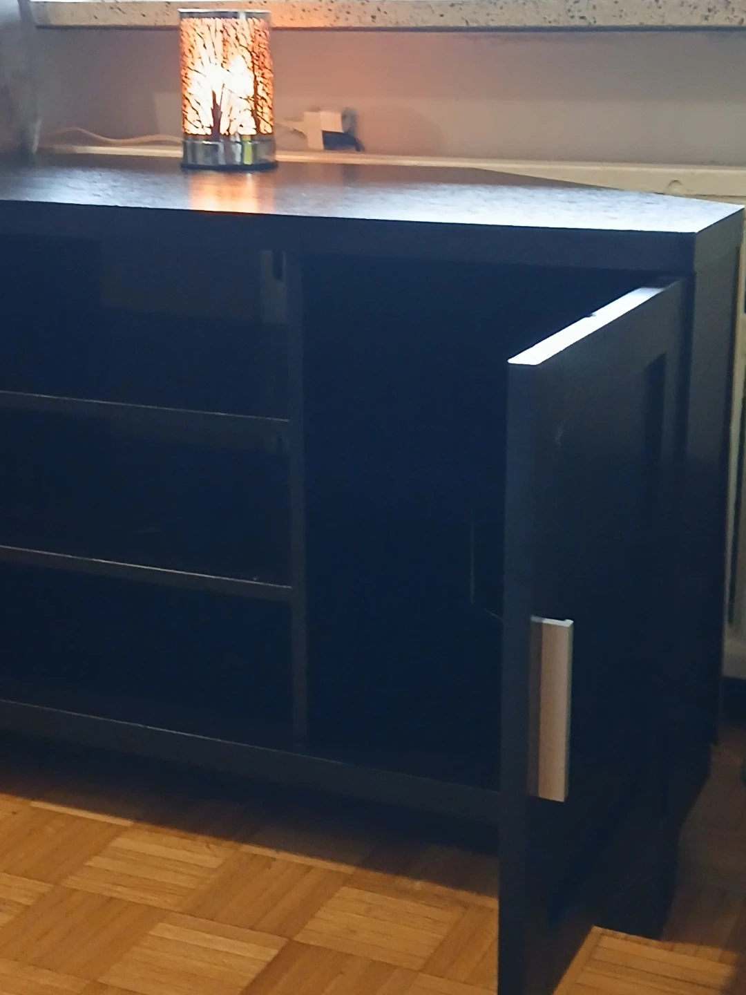 Dark chocolate wood tv console, has three shelves that are removable. Two compartment with doors with chrome handles, great for storage. In really good condition & very sturdy with minor scratches except on the second shelf as seen in the last pic. Please pickup thanks