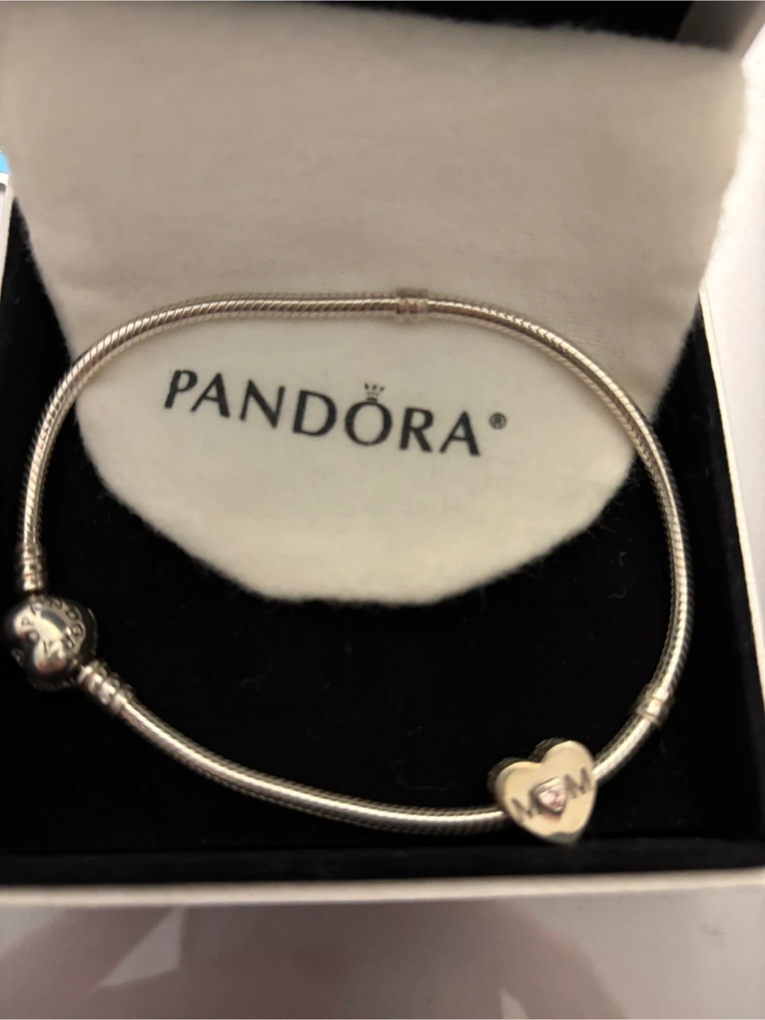 Selling a lovely Pandora charm bracelet. It comes with a cute 'Mom' heart charm. The bracelet is in excellent condition and comes with its original box!