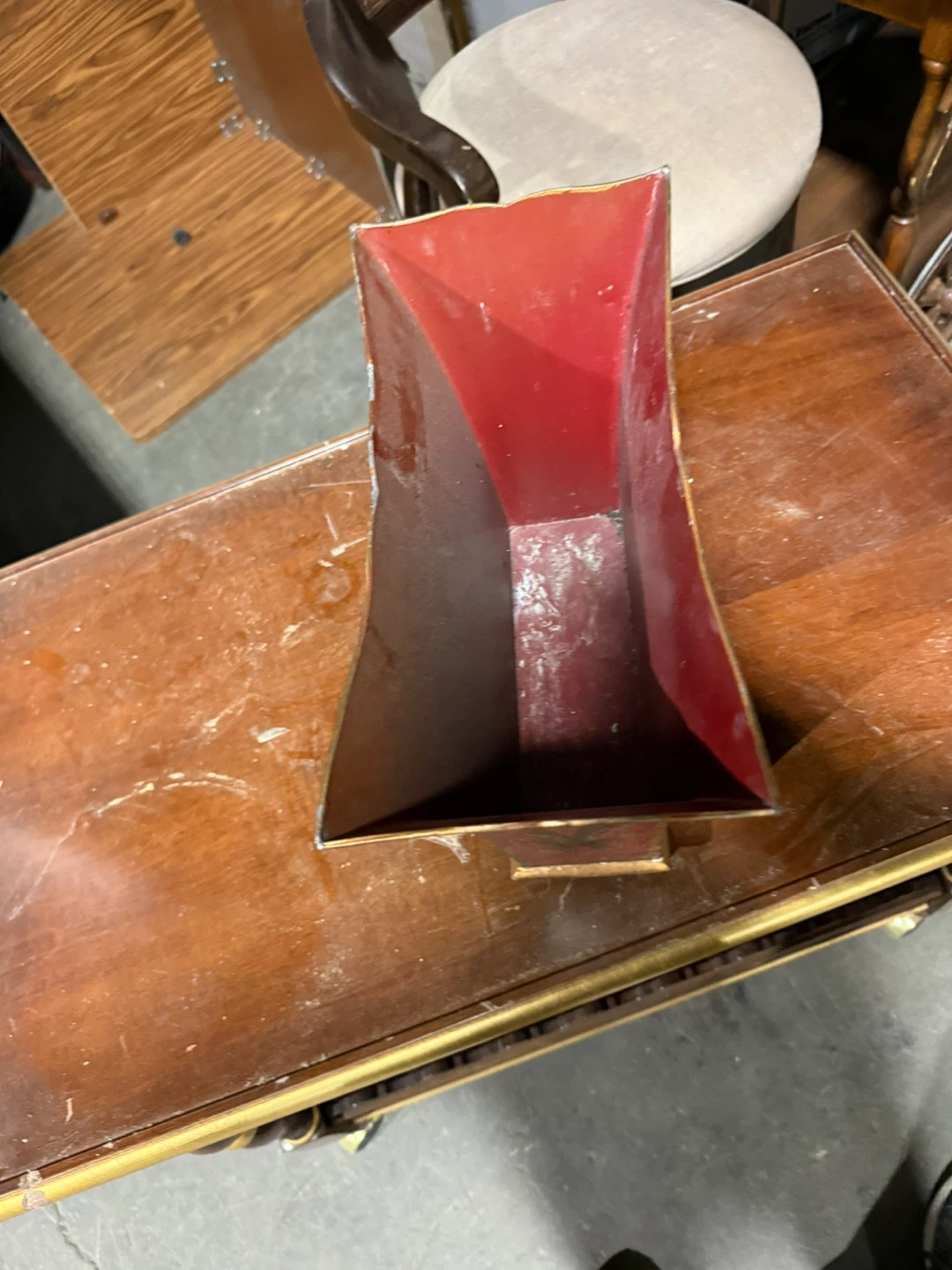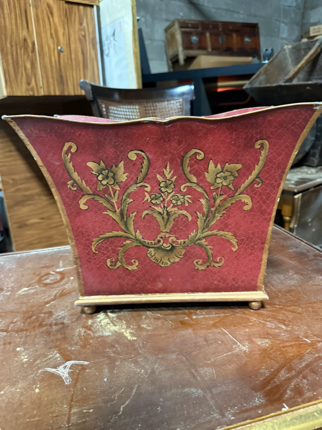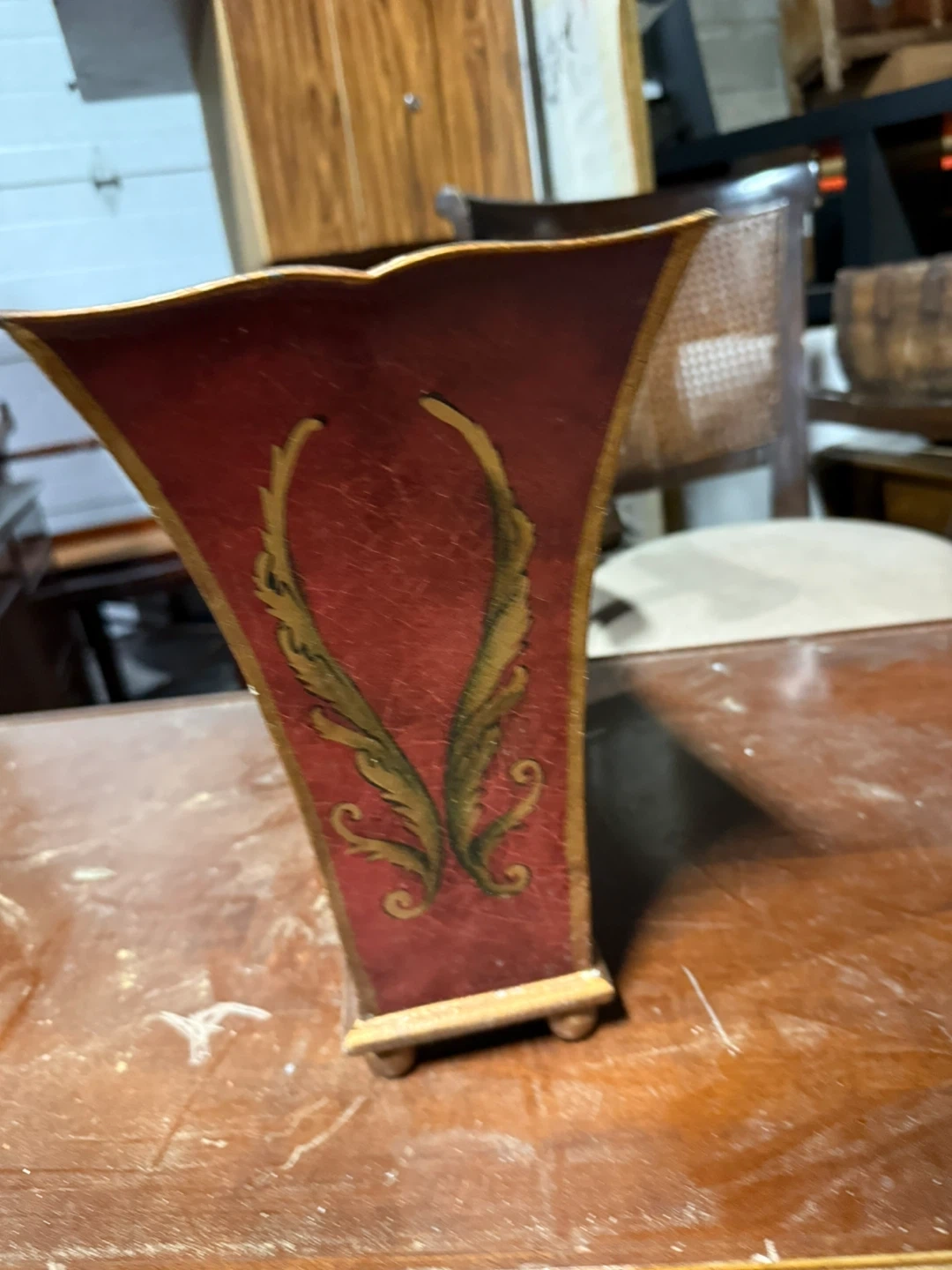 Selling a decorative vase with a unique shape and design! It's red with gold accents and floral patterns. Perfect for adding a touch of elegance to your home decor