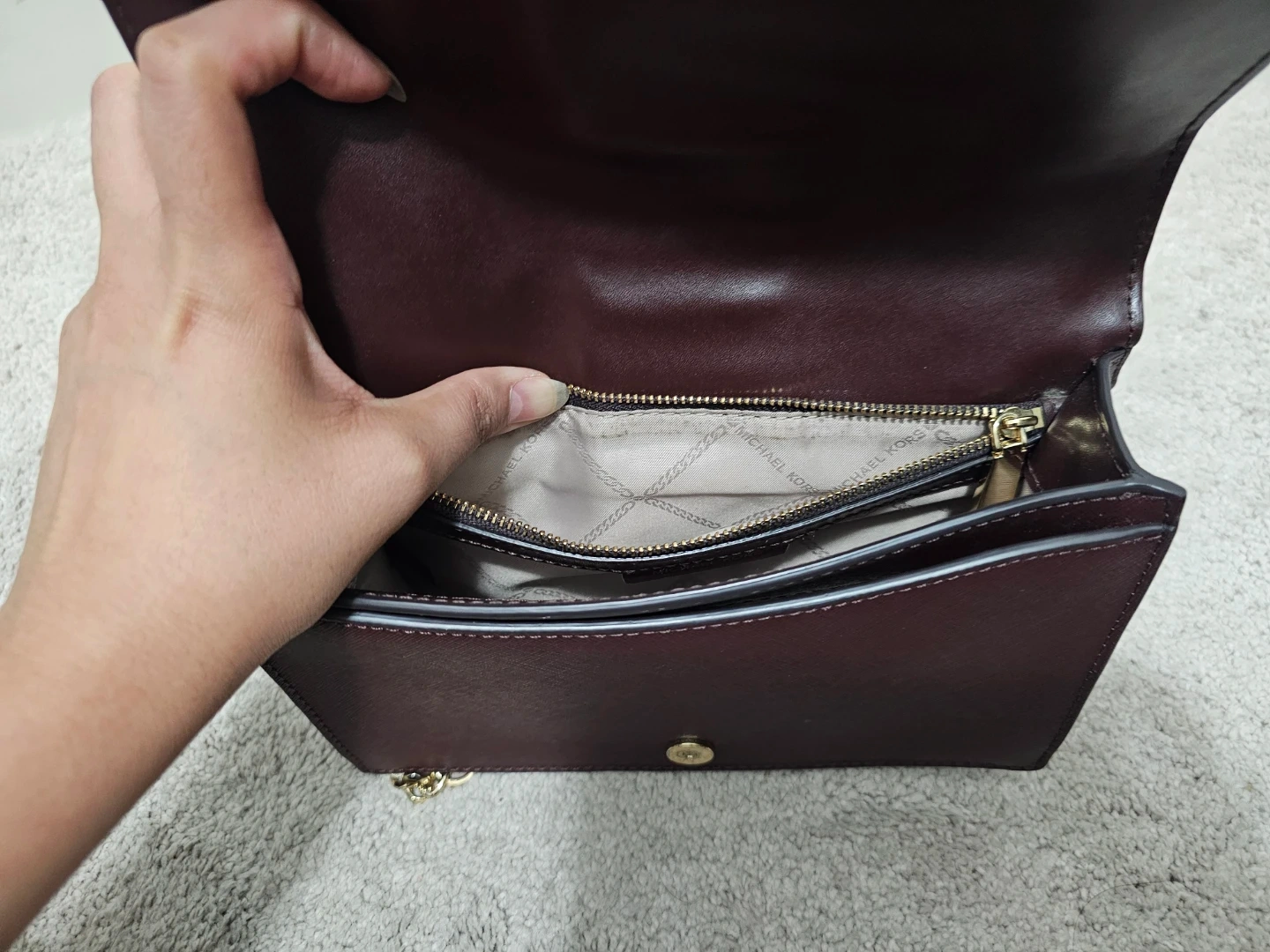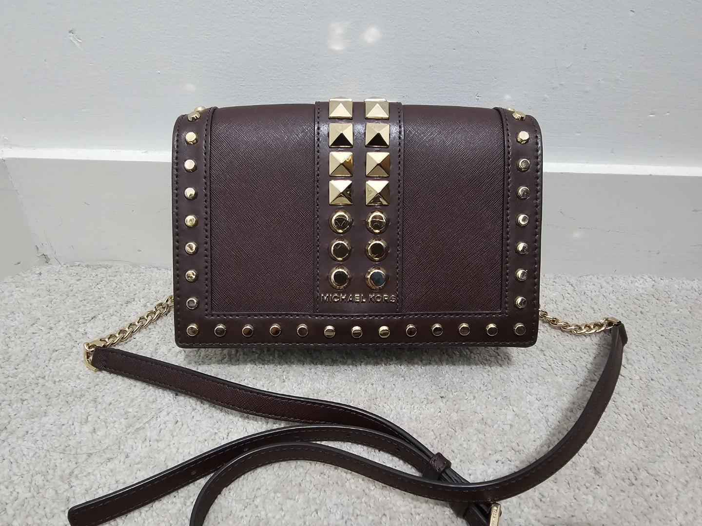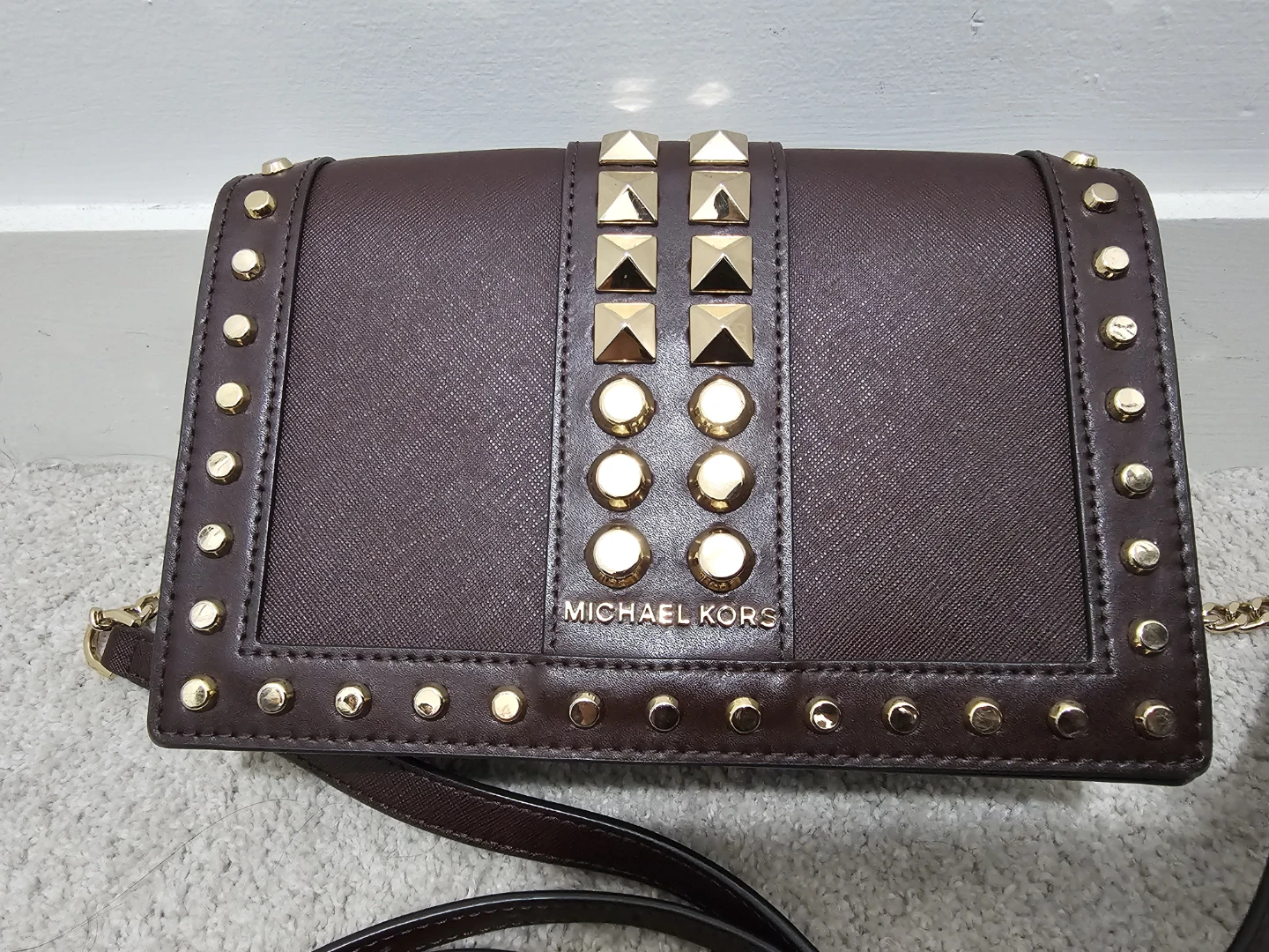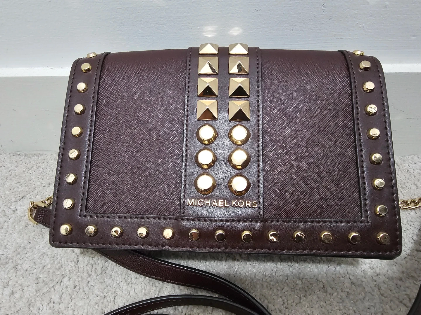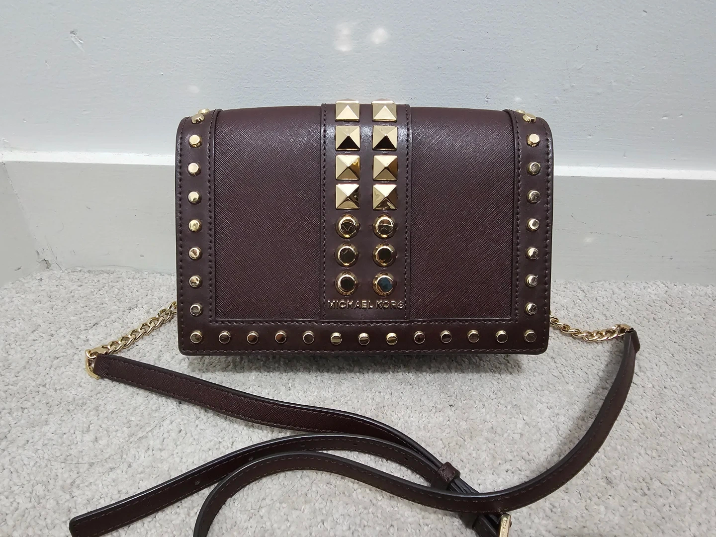 Selling a Michael Kors crossbody bag in a lovely Burgundy colour. It features stylish gold studs and a chain strap. It's in great condition and perfect for adding a touch of elegance to any outfit!