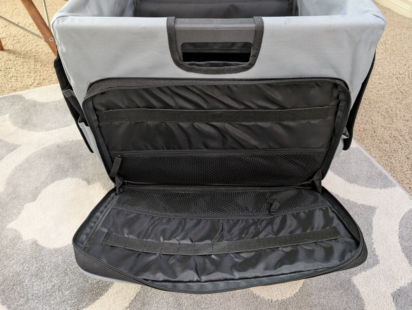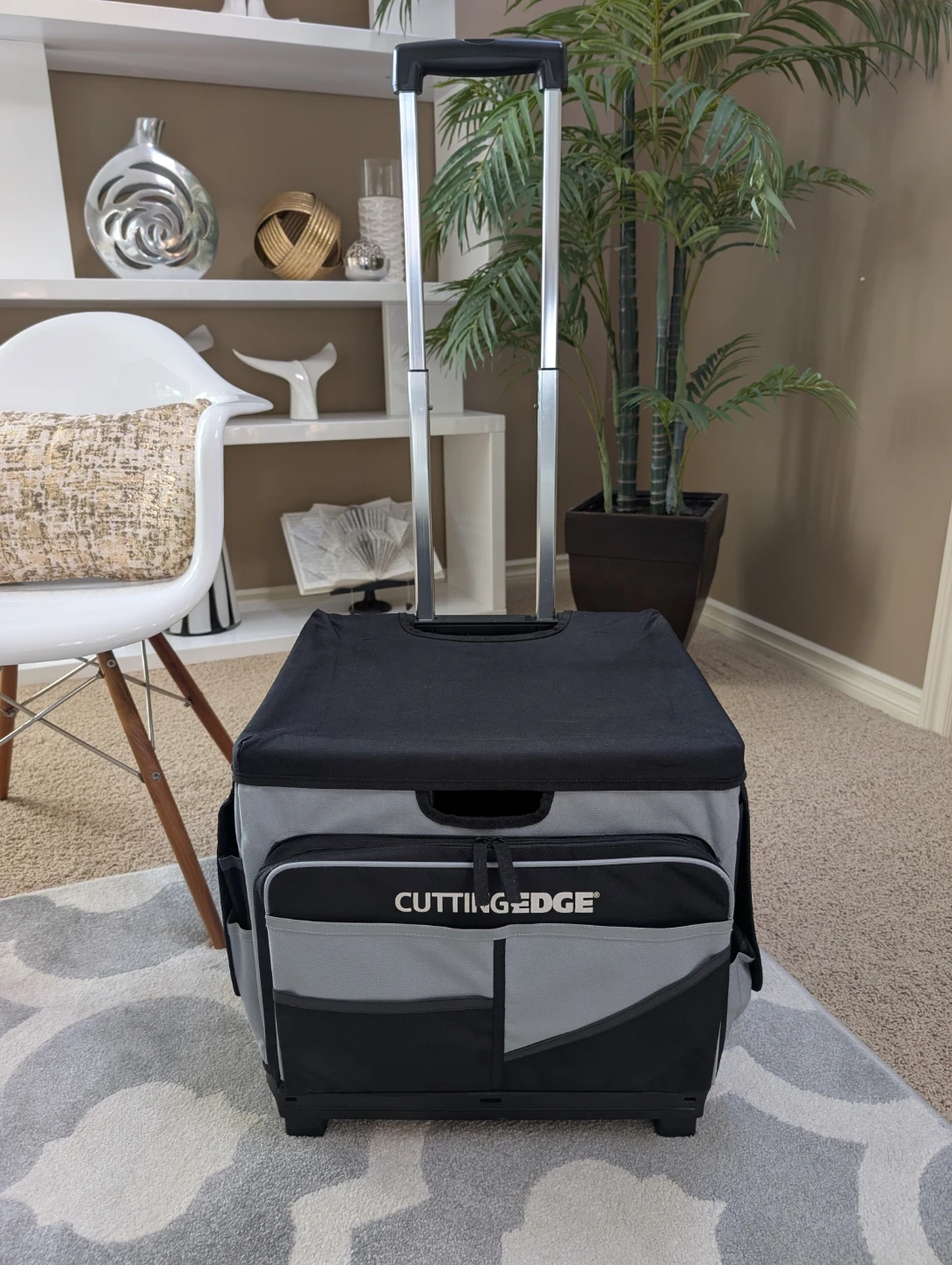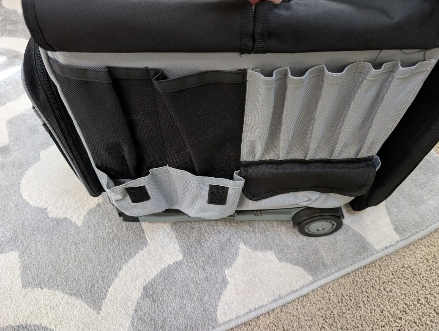 It has a pull-up handle, and rolls with ease. It has more pockets and compartments than you can count! It has an extra organizer box for organizing smaller items, AND it is completely collapsible for easy storage! (See photo #8)