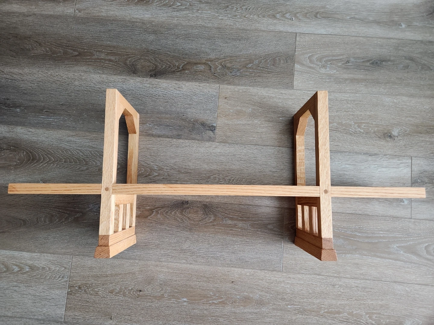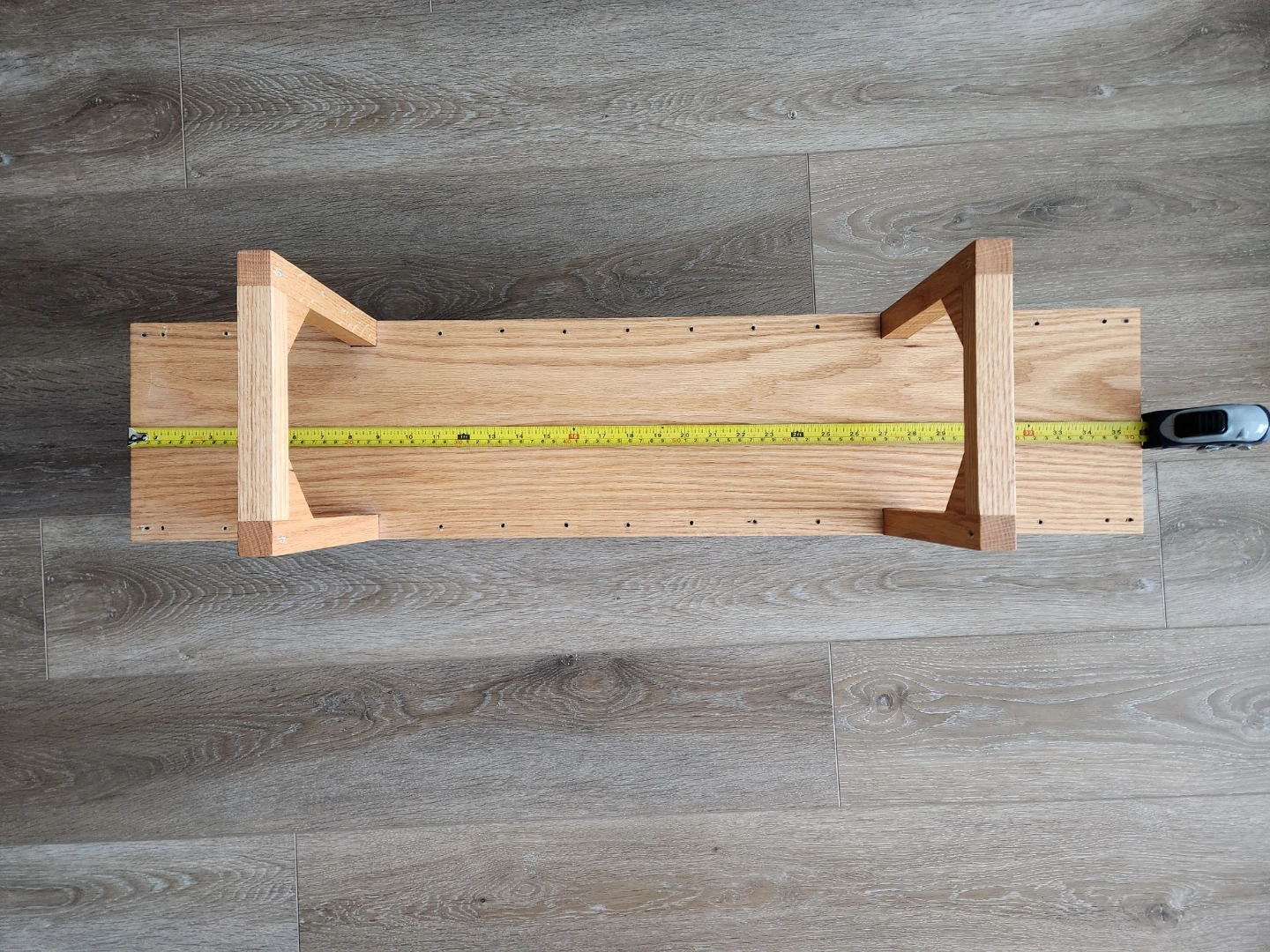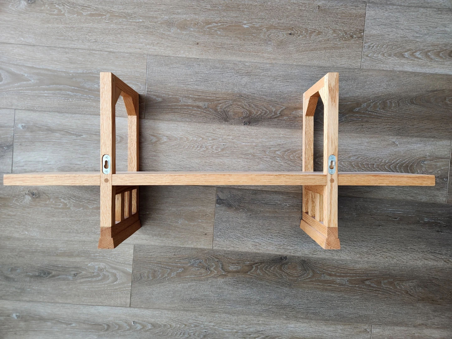 Wall hanging bookshelf, measuring 36 long, approx 15 high. Has wall hooks on back but it is pretty heavy (solid wood). Holes drilled into base to create the metal posts of a hanging bridge.