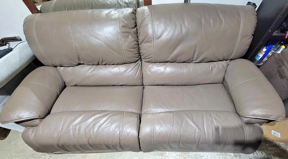 Selling this comfortable 100% leather LaZBoy brand electronic reclining sofa and matching chair and a half (love chair).
