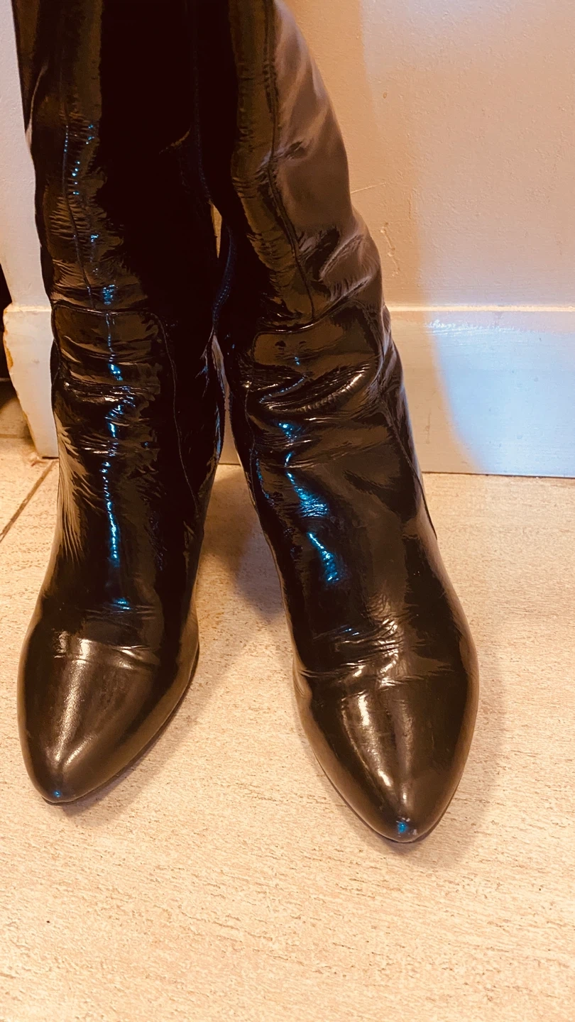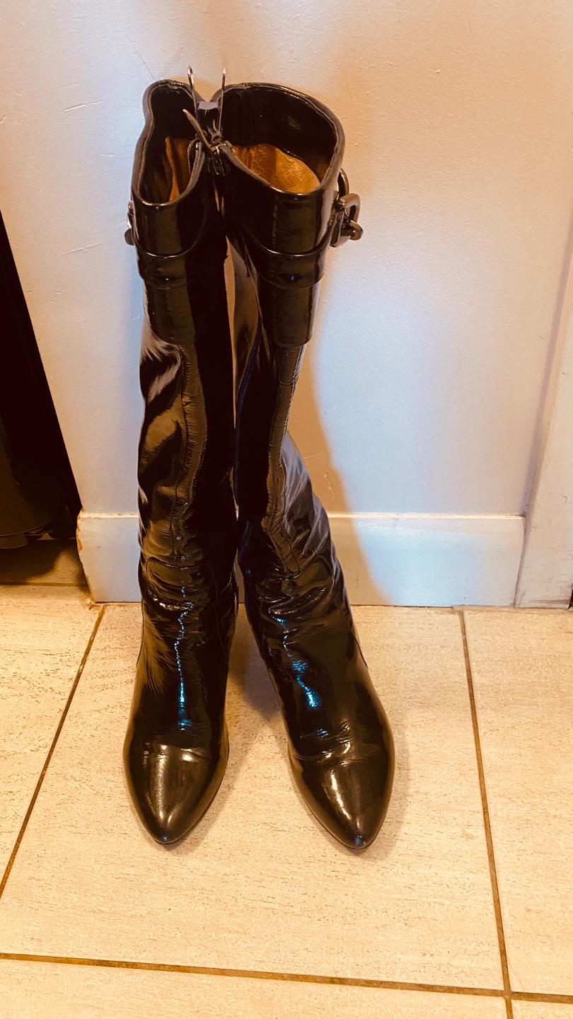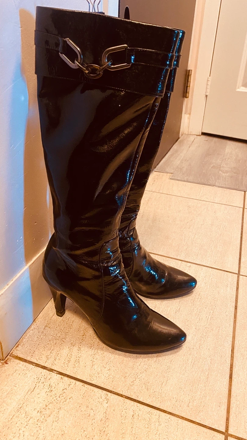 Selling a pair of black patent leather knee-high boots. They show some signs of wear on the heels, but otherwise they're in good condition. Perfect for adding a touch of chic to your wardrobe!