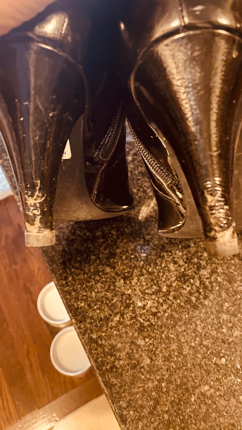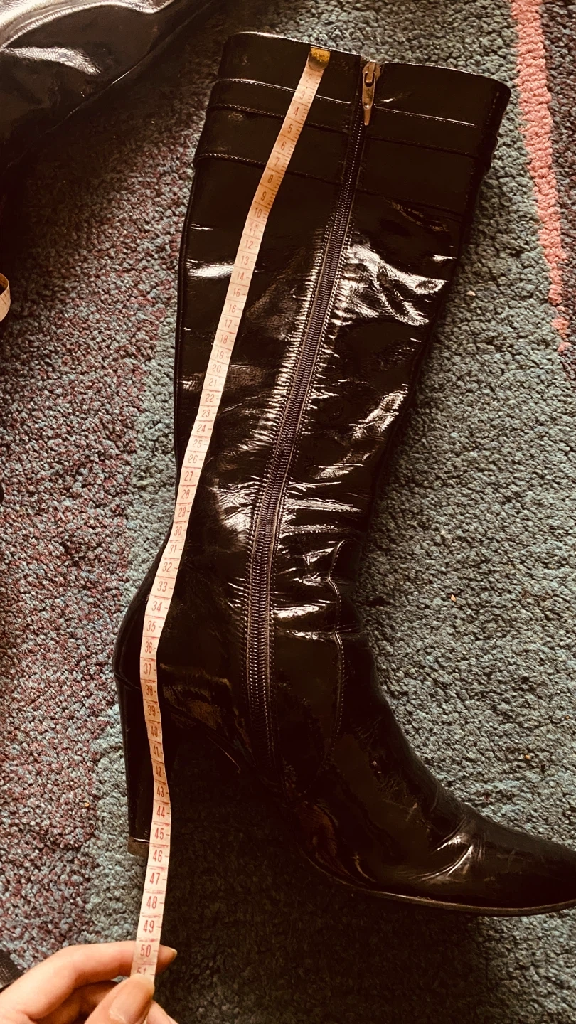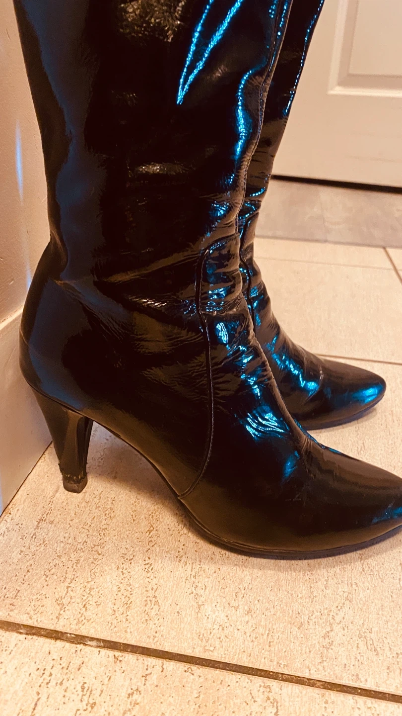 Selling a pair of black patent leather knee-high boots. They show some signs of wear on the heels, but otherwise they're in good condition. Perfect for adding a touch of chic to your wardrobe!