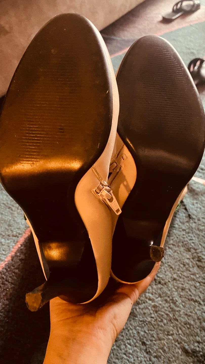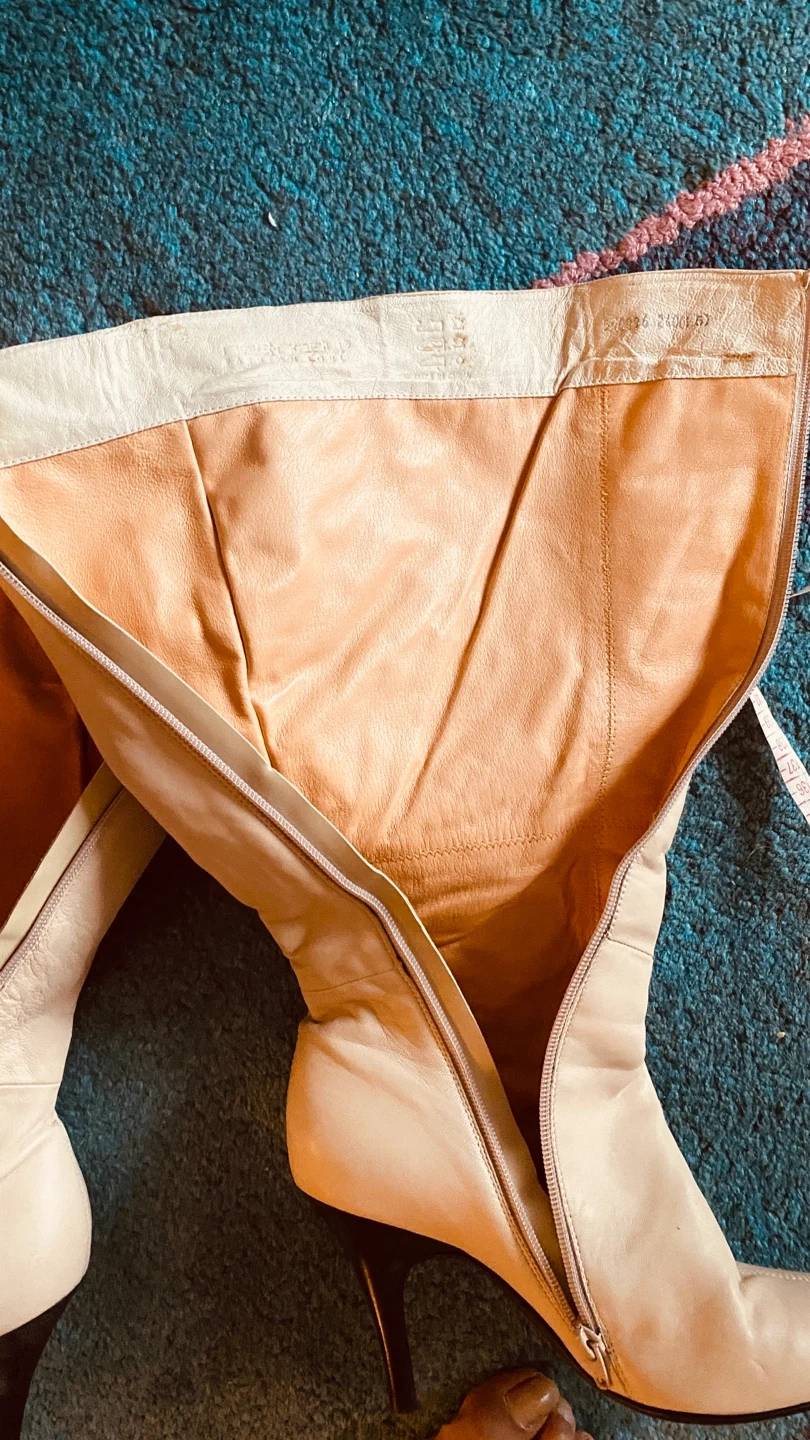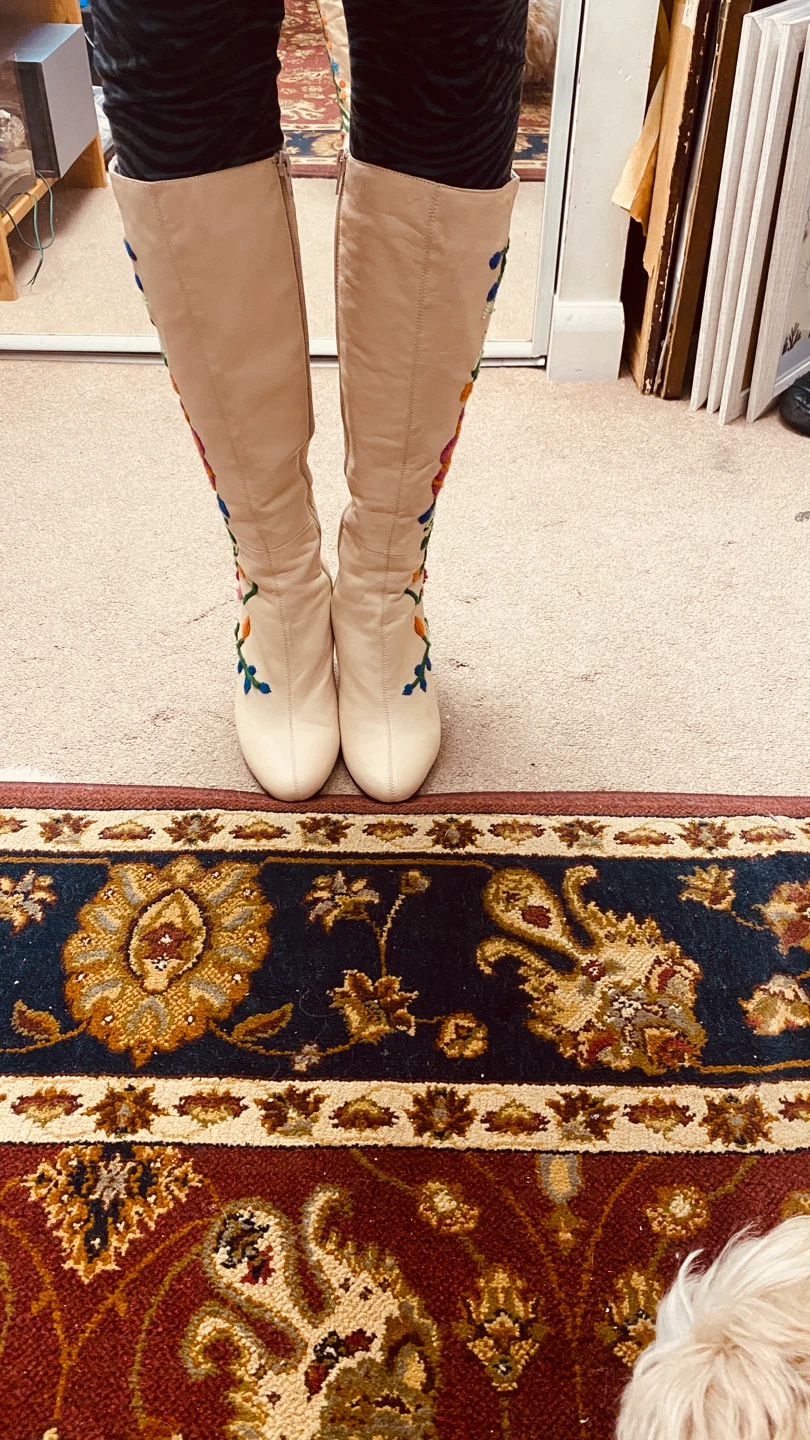These are a pair of knee-high leather boots in a light beige or cream colour. They feature a beautiful floral embroidery design on the sides, adding a unique touch. The boots have a stiletto heel and a zipper closure. They appear to be in good condition.