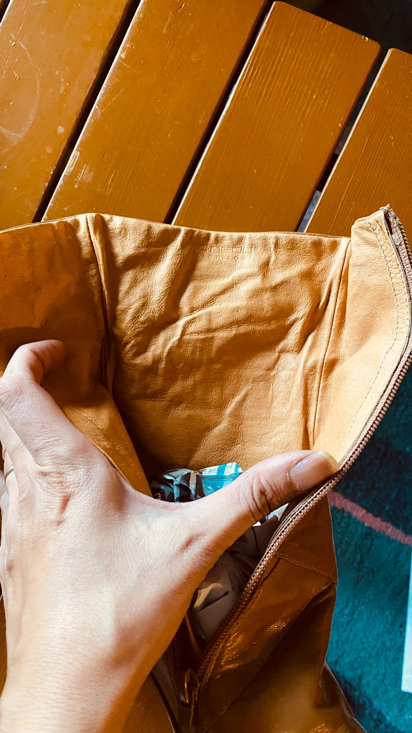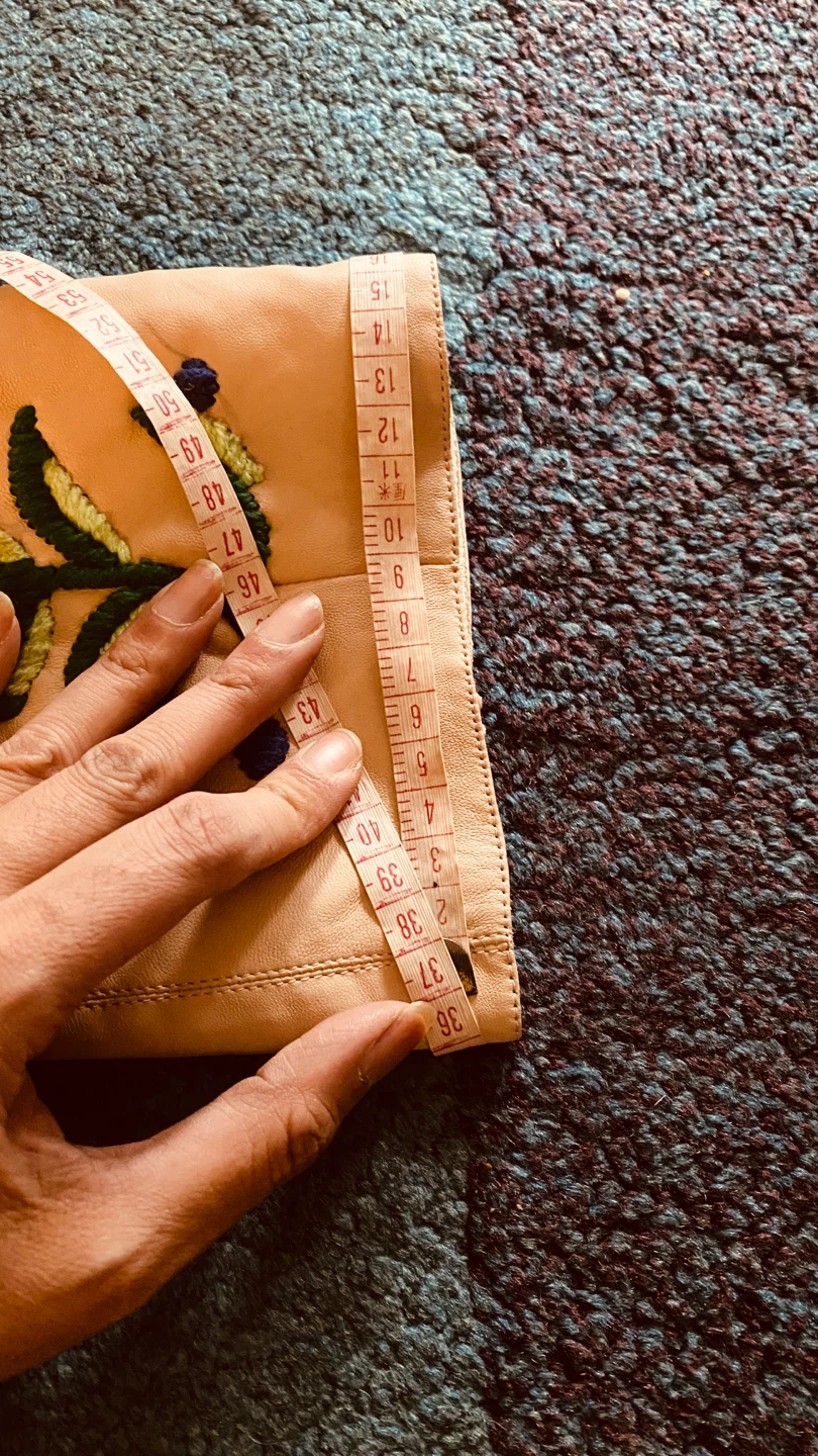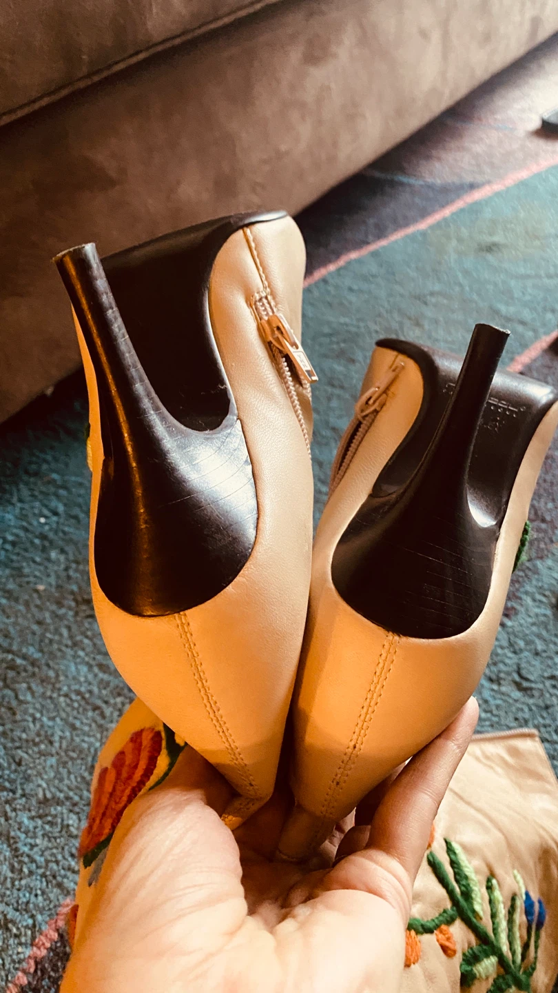 These are a pair of knee-high leather boots in a light beige or cream colour. They feature a beautiful floral embroidery design on the sides, adding a unique touch. The boots have a stiletto heel and a zipper closure. They appear to be in good condition.