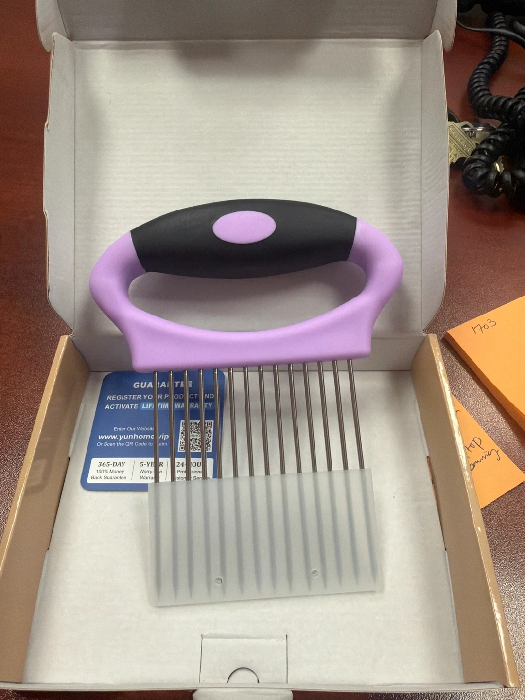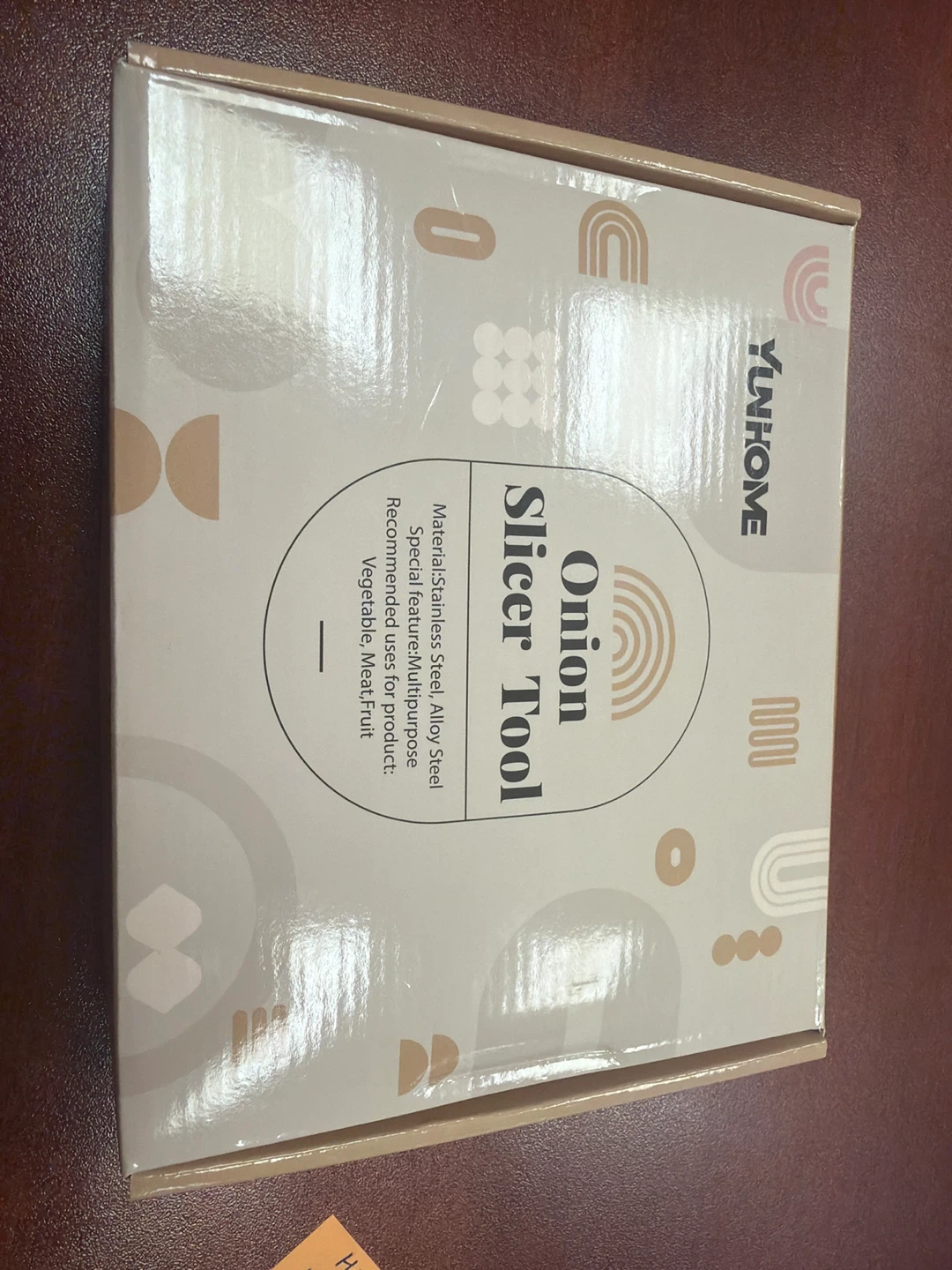 Selling a brand new Yunhome onion slicer tool! It's still in its original box and has never been used. This tool is made of stainless steel and alloy steel, designed for multipurpose use with vegetables, meat, and fruit. Perfect for quick and easy slicing!
