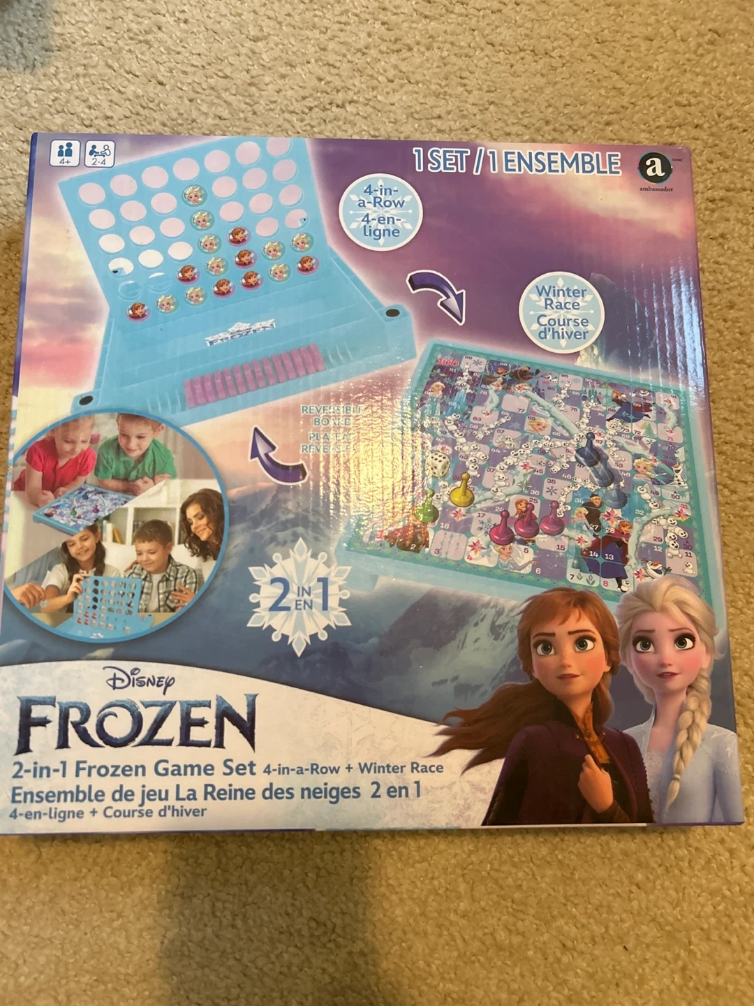 Selling a brand new Disney Frozen 2-in-1 Game Set! This set includes both 4-in-a-row and Winter Race games. It comes with 1 collapsible playing board, 42 playing pieces, 4 coloured playing pieces, 1 dice, and instructions. Hours of fun for the whole family!