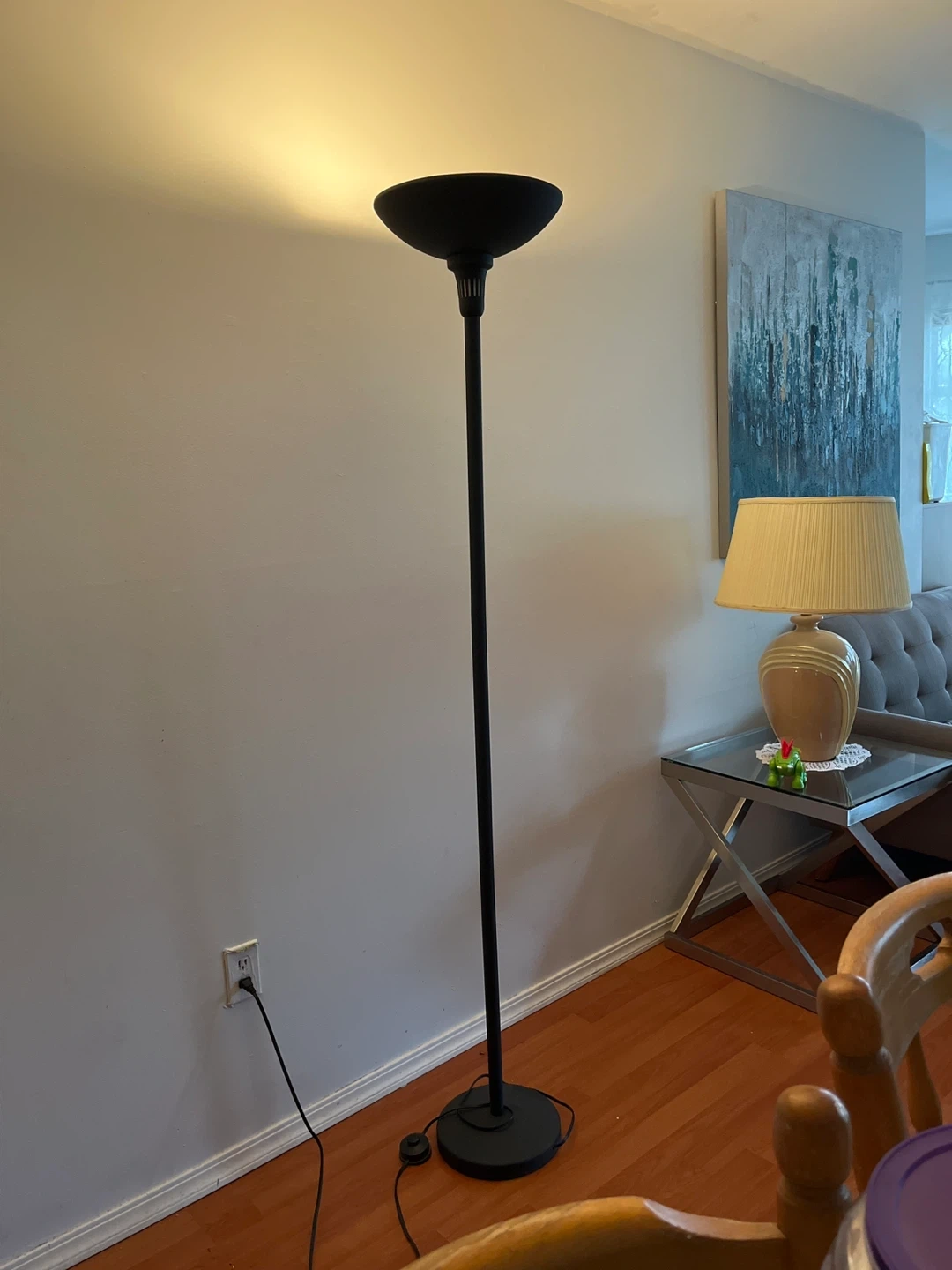 Selling a simple black floor lamp! It's in great condition and ready to light up your space. It has a foot switch, making it easy to turn on and off.