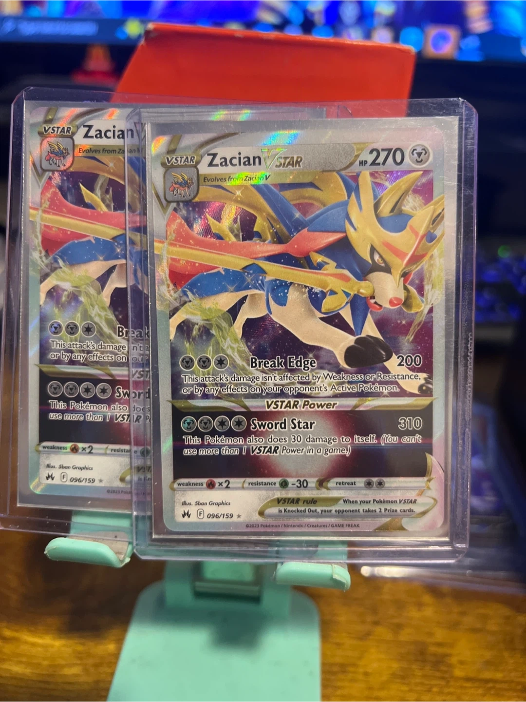 Selling a Zacian VSTAR Pokemon card. It evolves from Zacian V and has 270 HP. The card features the Break Edge attack and the Sword Star VSTAR Power. It's card number 096/159 from the set. Great for any Pokémon card collector!