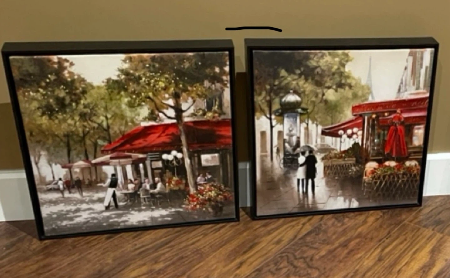 Selling a set of two framed wall art pieces featuring a charming Paris cafe scene. These are perfect for adding a touch of Parisian flair to your home decor! They are in great condition and ready to hang.