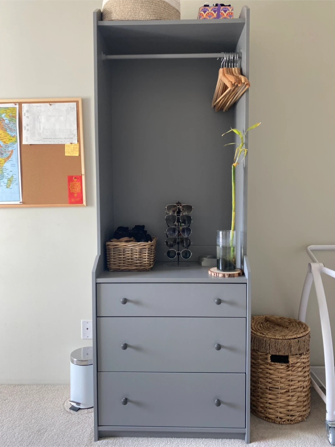 Selling a grey IKEA PAX wardrobe with drawers. It's in great shape and ready to organize your space! This wardrobe features a hanging rod at the top and three spacious drawers for folded clothes or other items. Perfect for adding extra storage to a bedroom or closet.