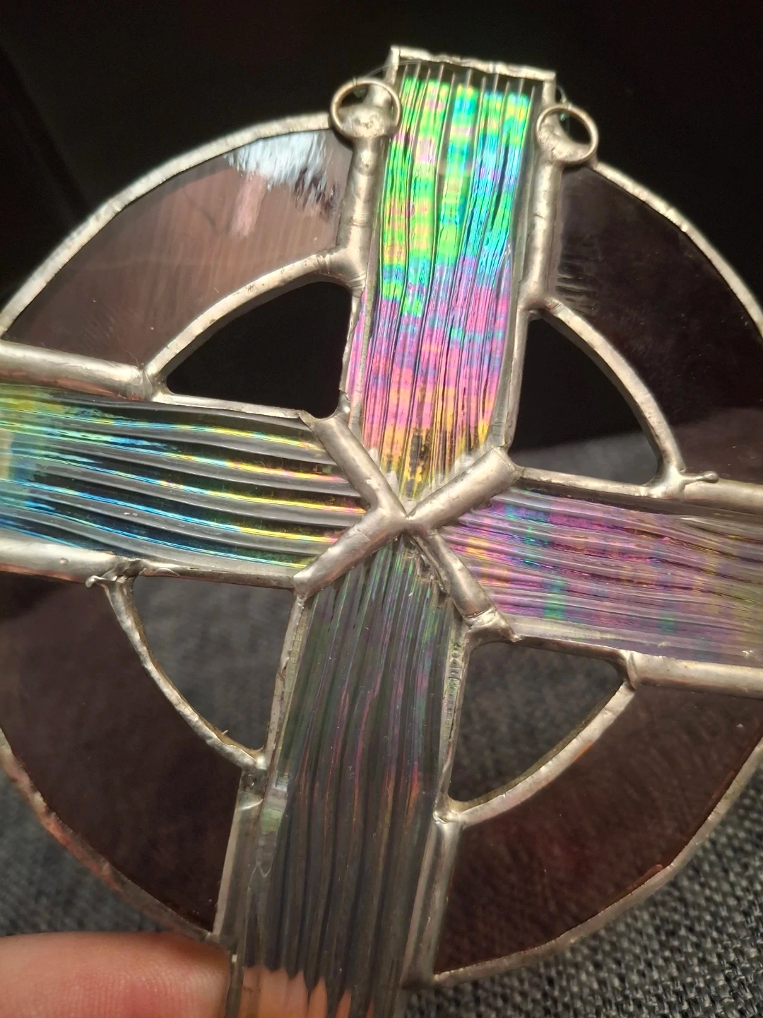Selling a beautiful stained glass Celtic cross ornament. It has a unique iridescent finish that catches the light, making it a lovely addition to any space