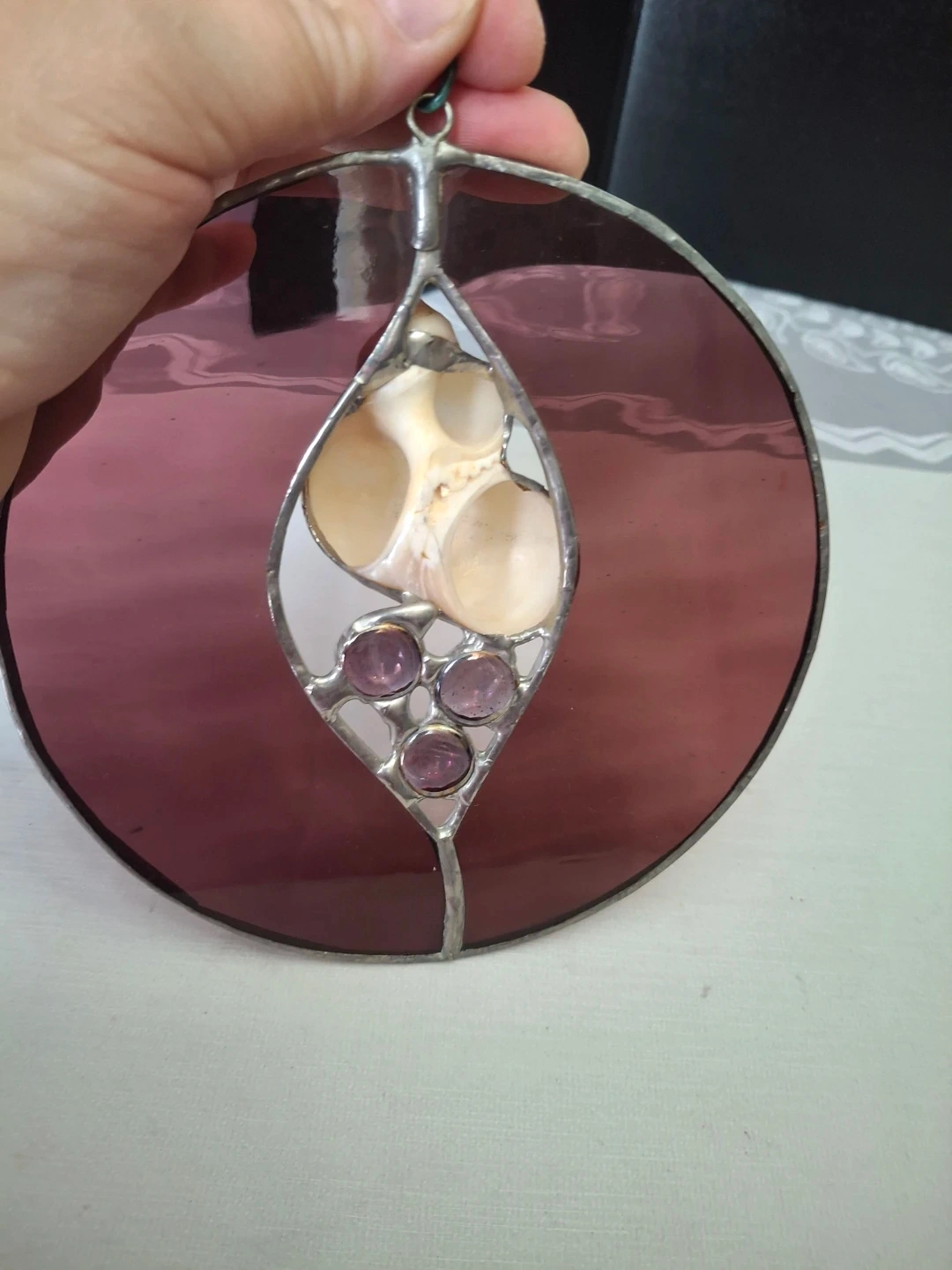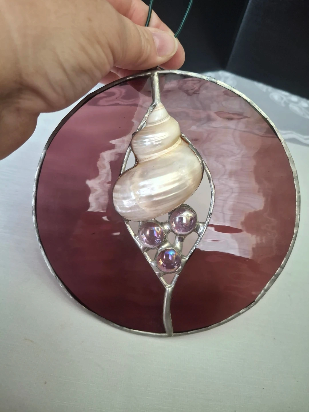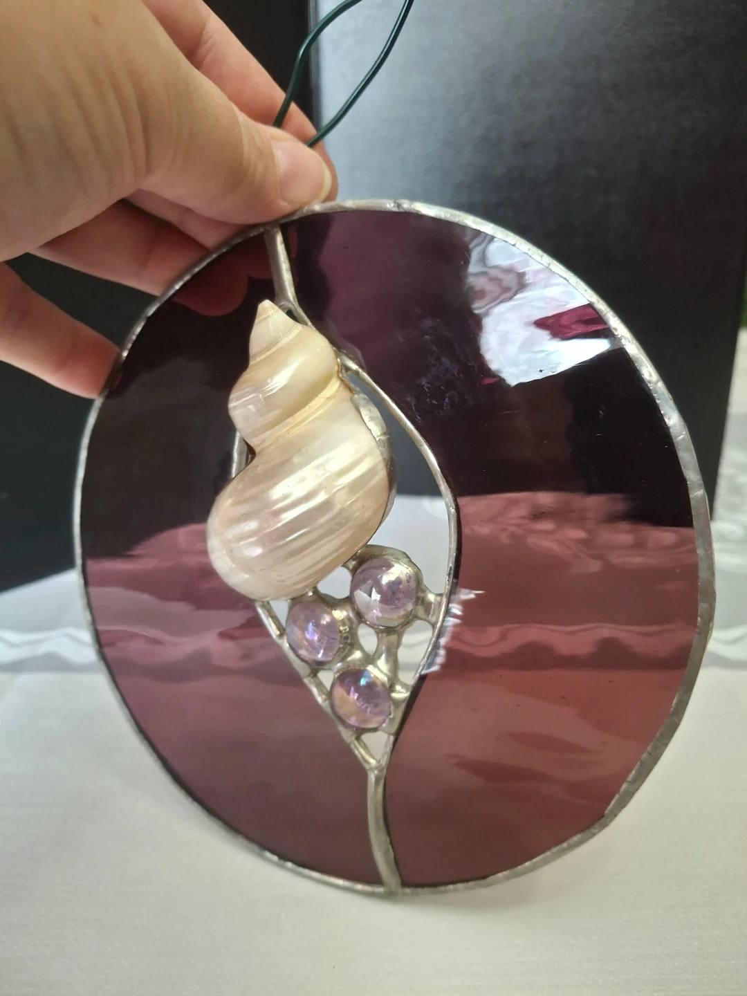 A beautiful stained glass ornament featuring a seashell and iridescent beads. It's in great shape and would make a lovely addition to any room!