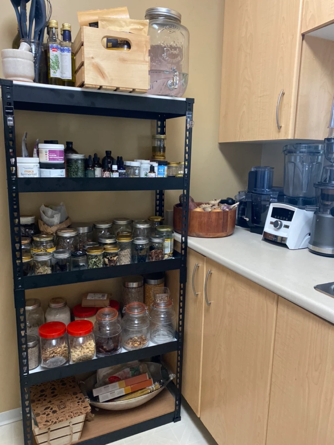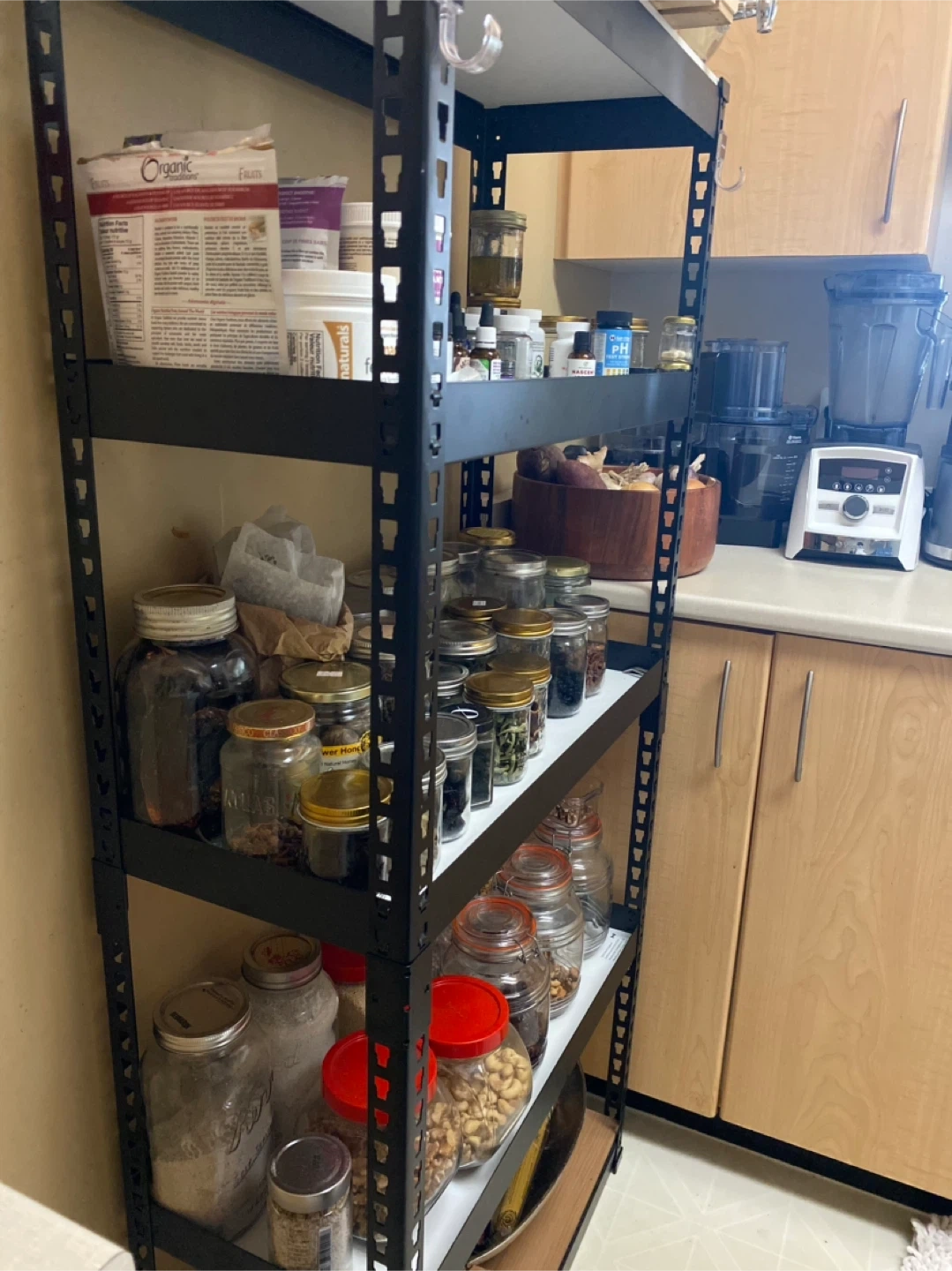Here's a heavy duty black metal storage shelf perfect for organizing your pantry or any room in your home. It's sturdy and in great condition, ready to hold all your essentials! Great to place in your garage or storage for tools or back up pantry items.