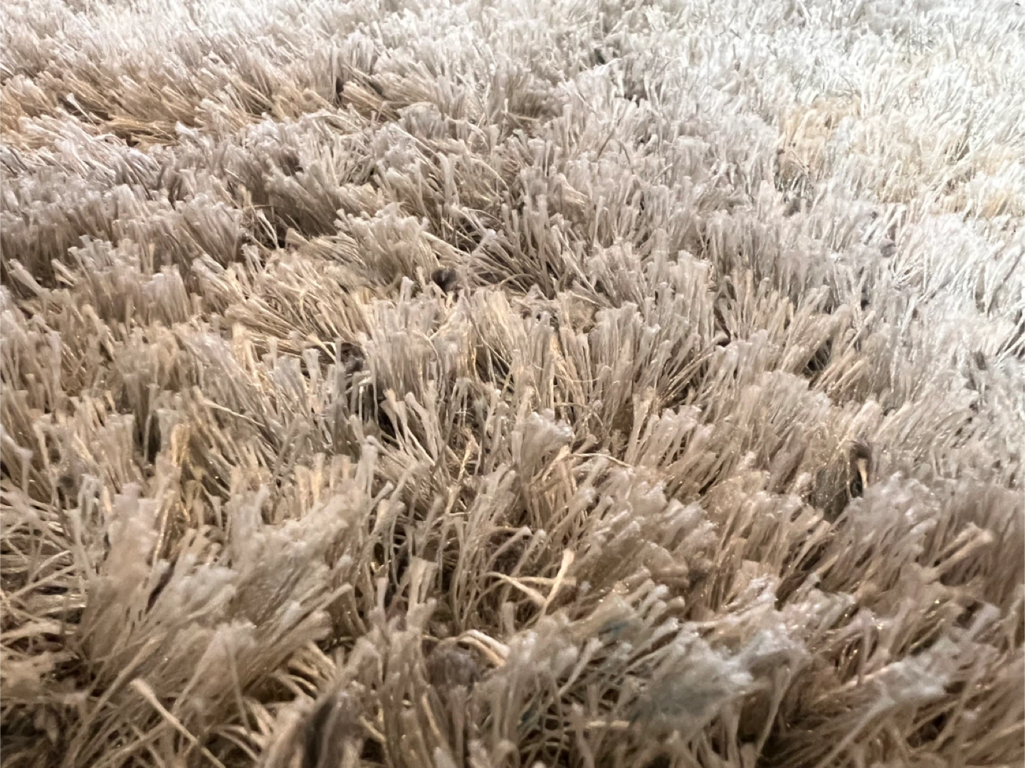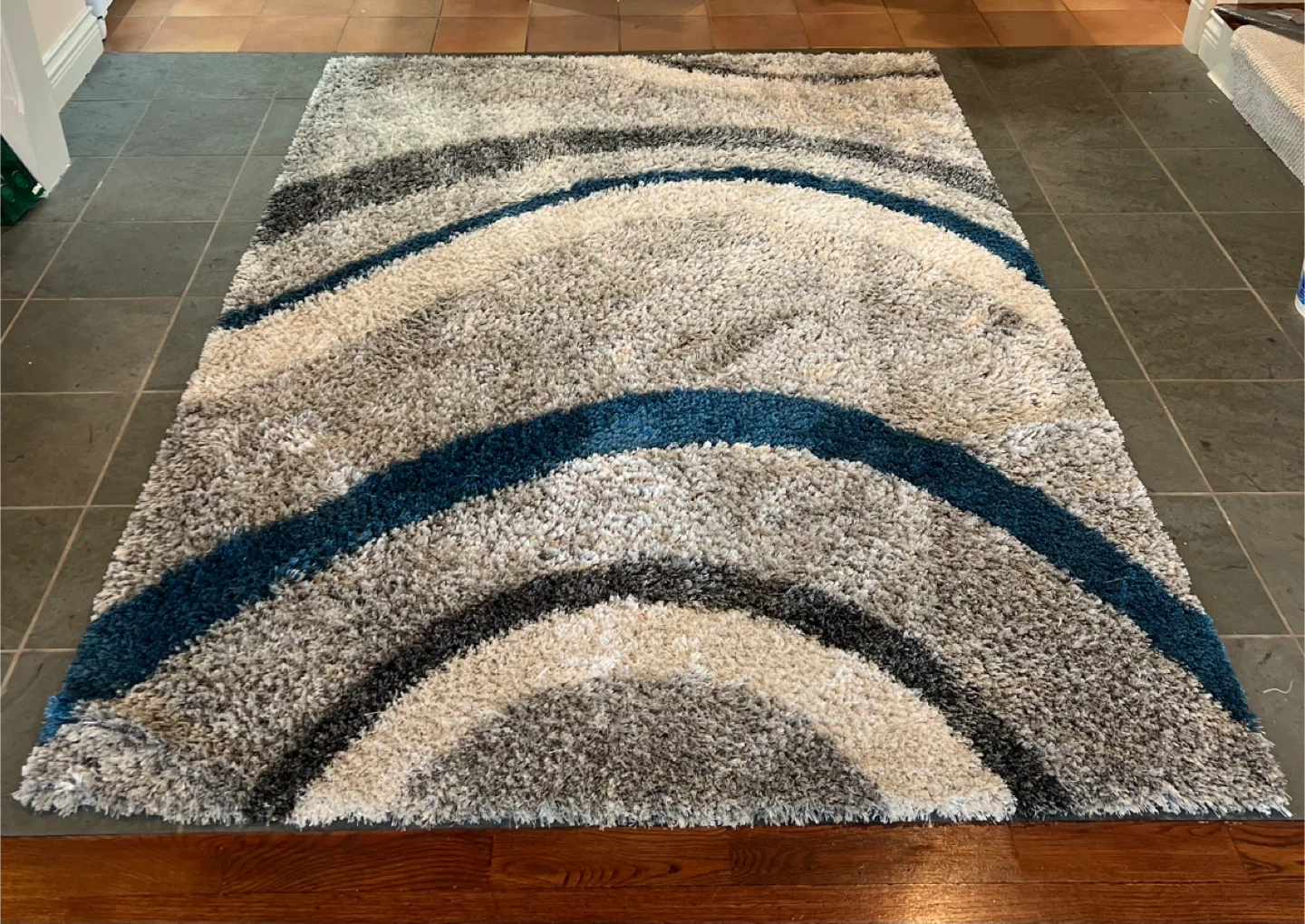 Selling a lovely area rug in shades of blue, grey, and beige. It has a soft, shaggy texture and a modern design that would look great in any living room or bedroom or office. It's in very good condition.
