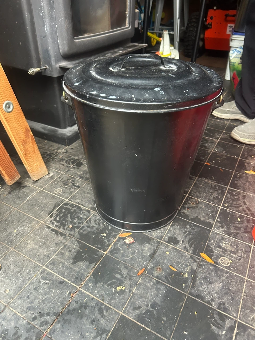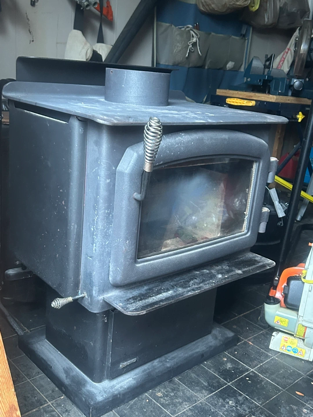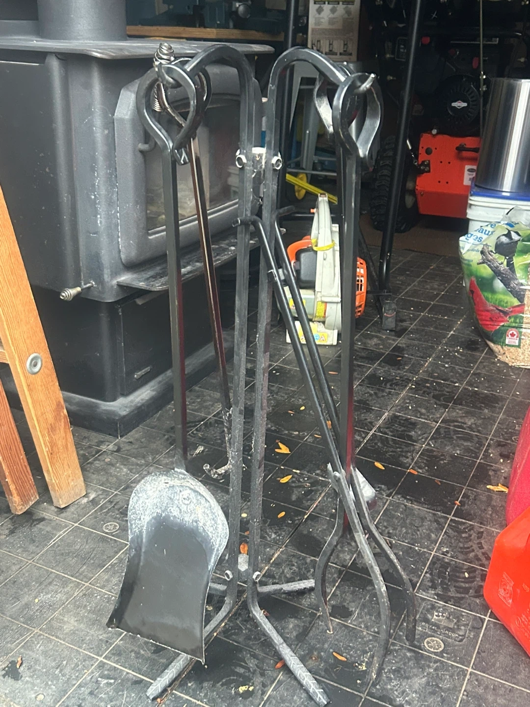 Selling a used black wood stove and some accessories. It includes a metal log holder, a metal ash bucket with a lid, ash vacuum, and a set of fireplace tools. Great for keeping warm during the winter months!