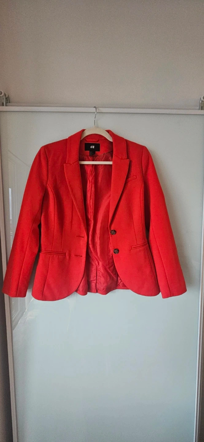 A vibrant red blazer from H&M in excellent condition! This blazer is a size 6 (EUR 36, CA 6). Perfect for work, a casual look, evening event, the holidays, and for adding a pop of colour to your wardrobe.
