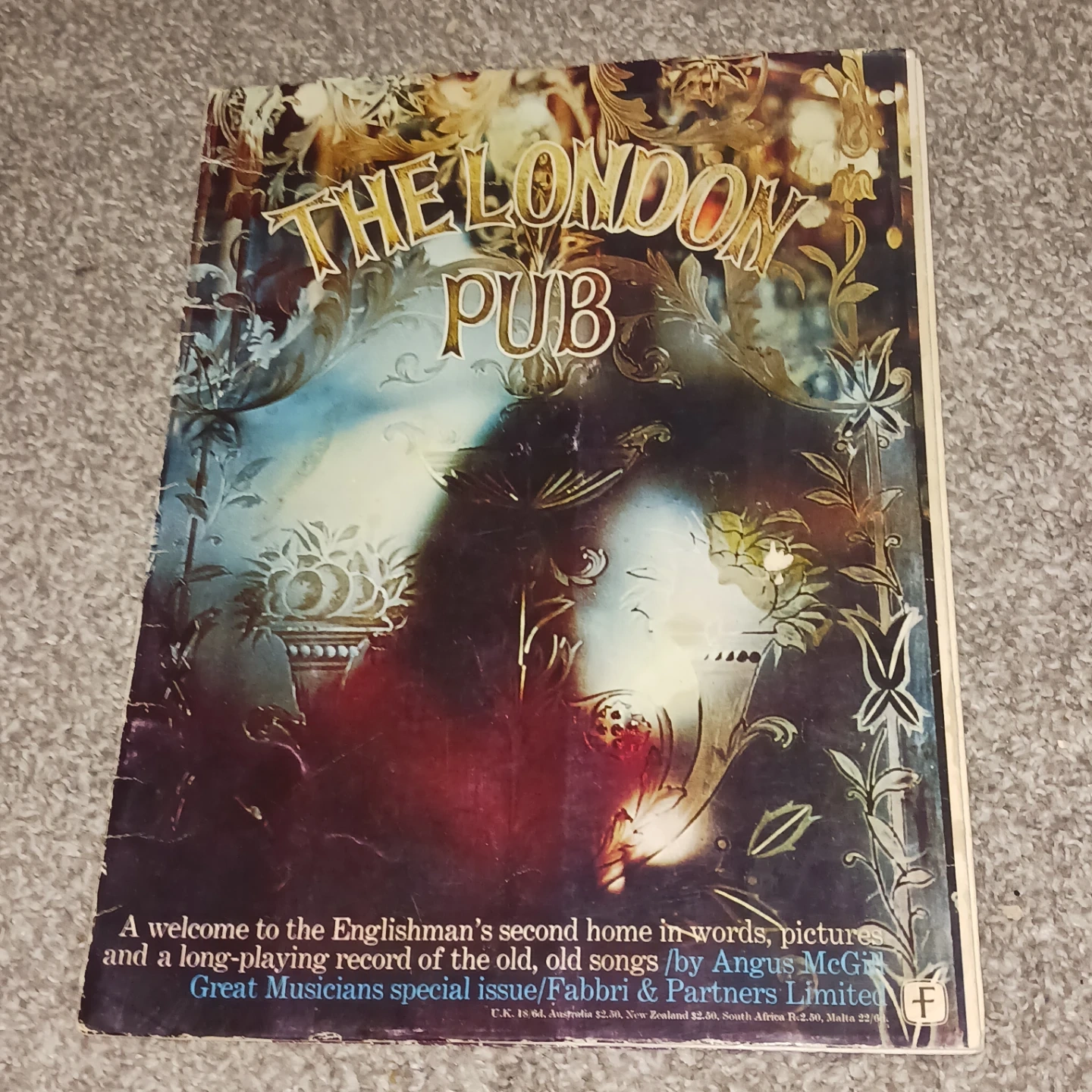Selling 'The London Pub' book, which is a welcome to the Englishman's second home in words, pictures, and a long-playing record of the old, old songs by Angus McGill. Great Musicians special issue/Fabbri & Partners Limited.